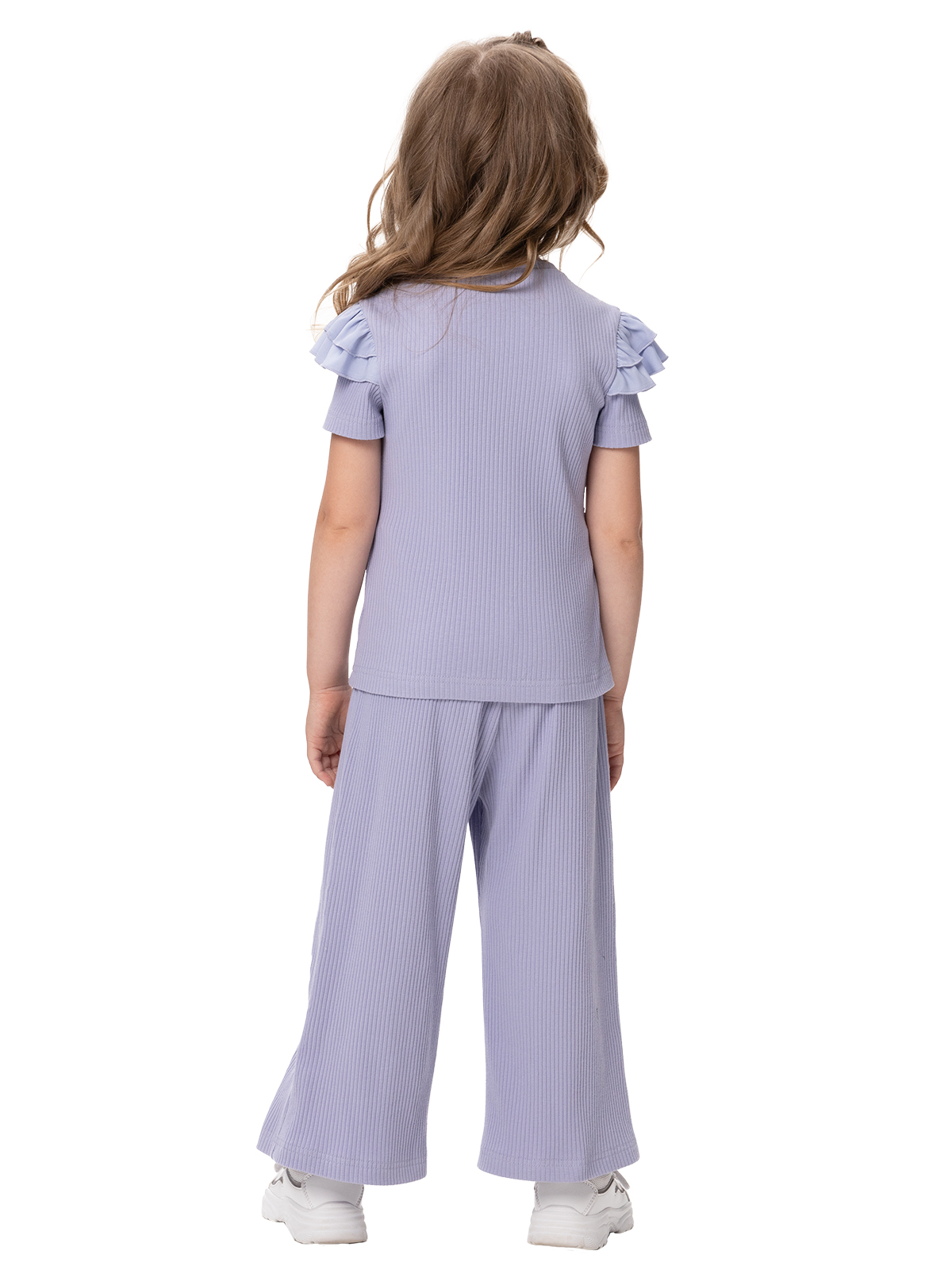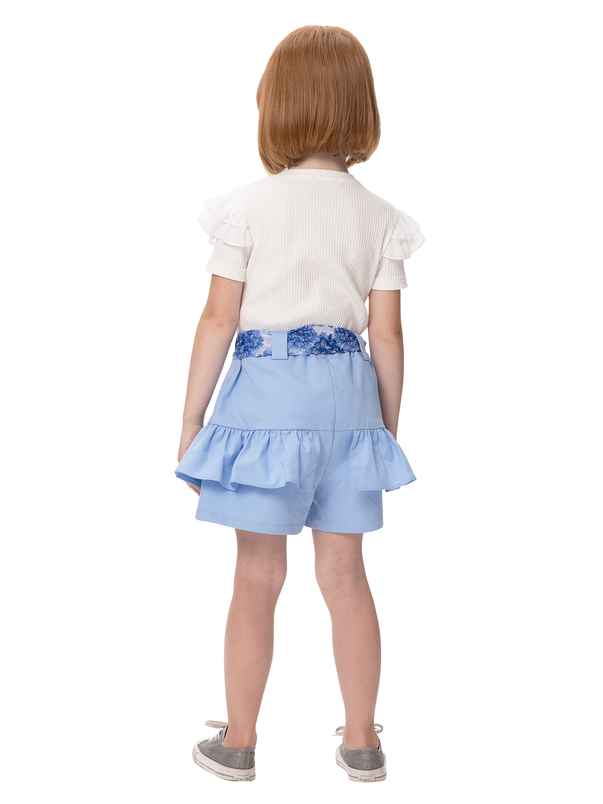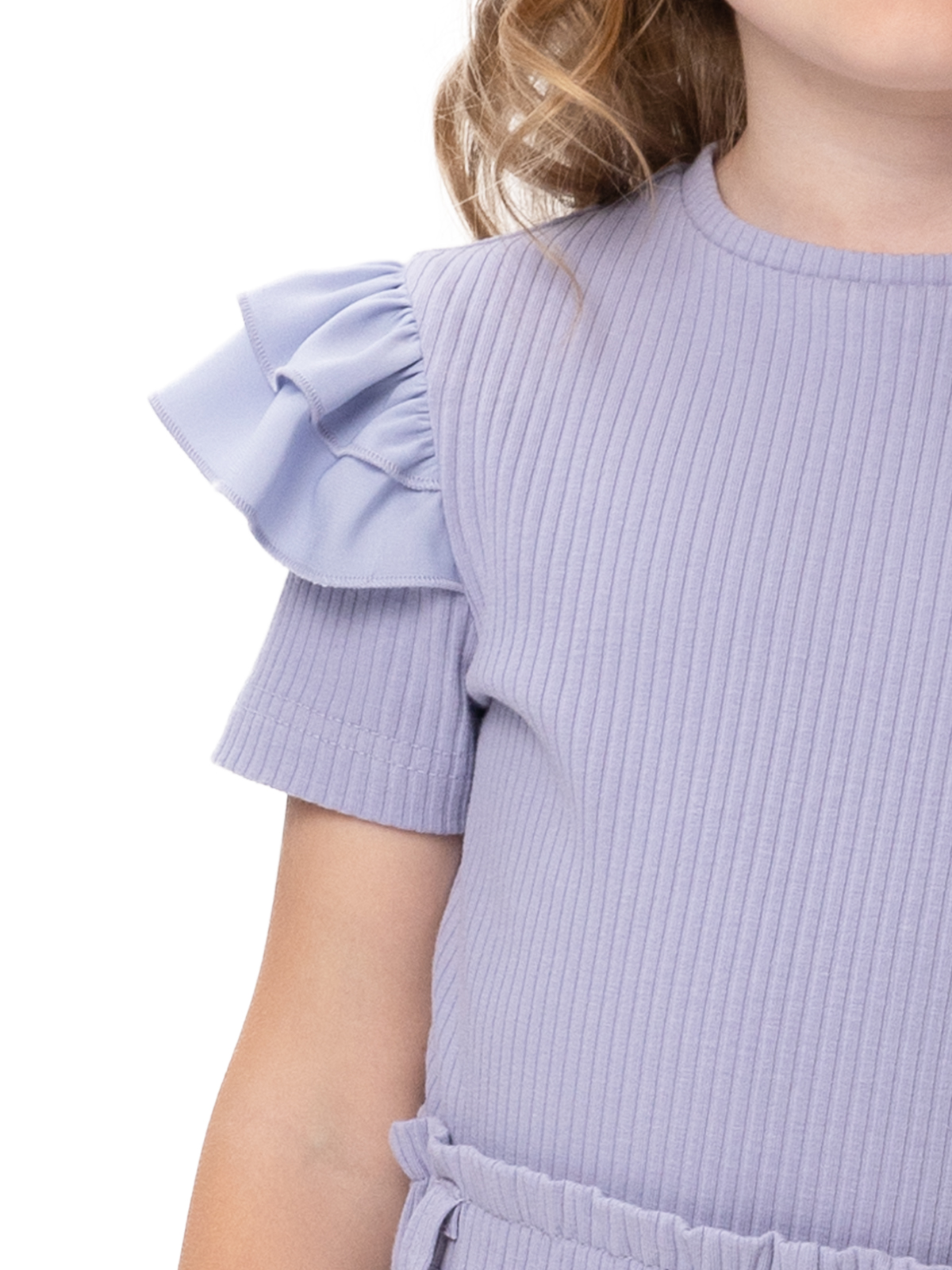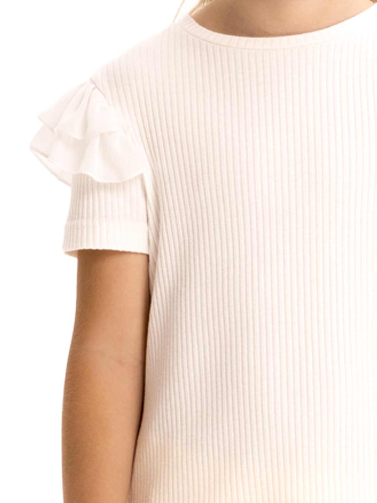 Джемпер из фактурного трикотажа, короткие рукава, в пройму вставлено два ряда оборок из шифона, по горловине притачивается бейка.