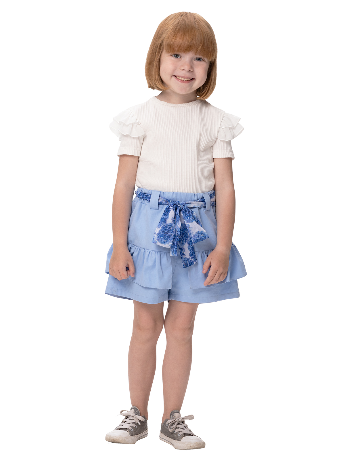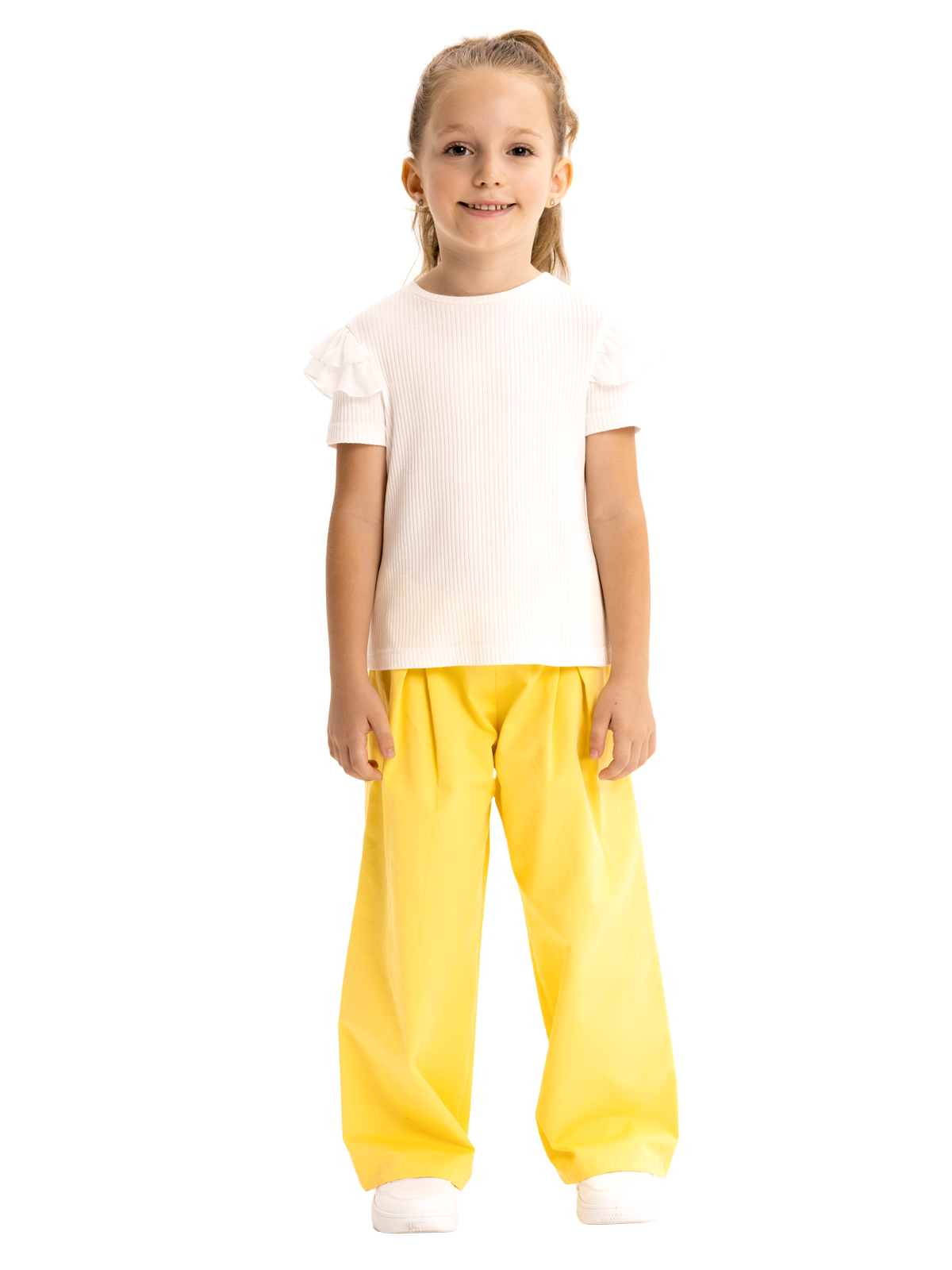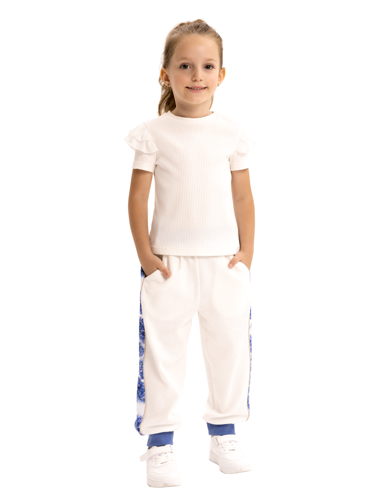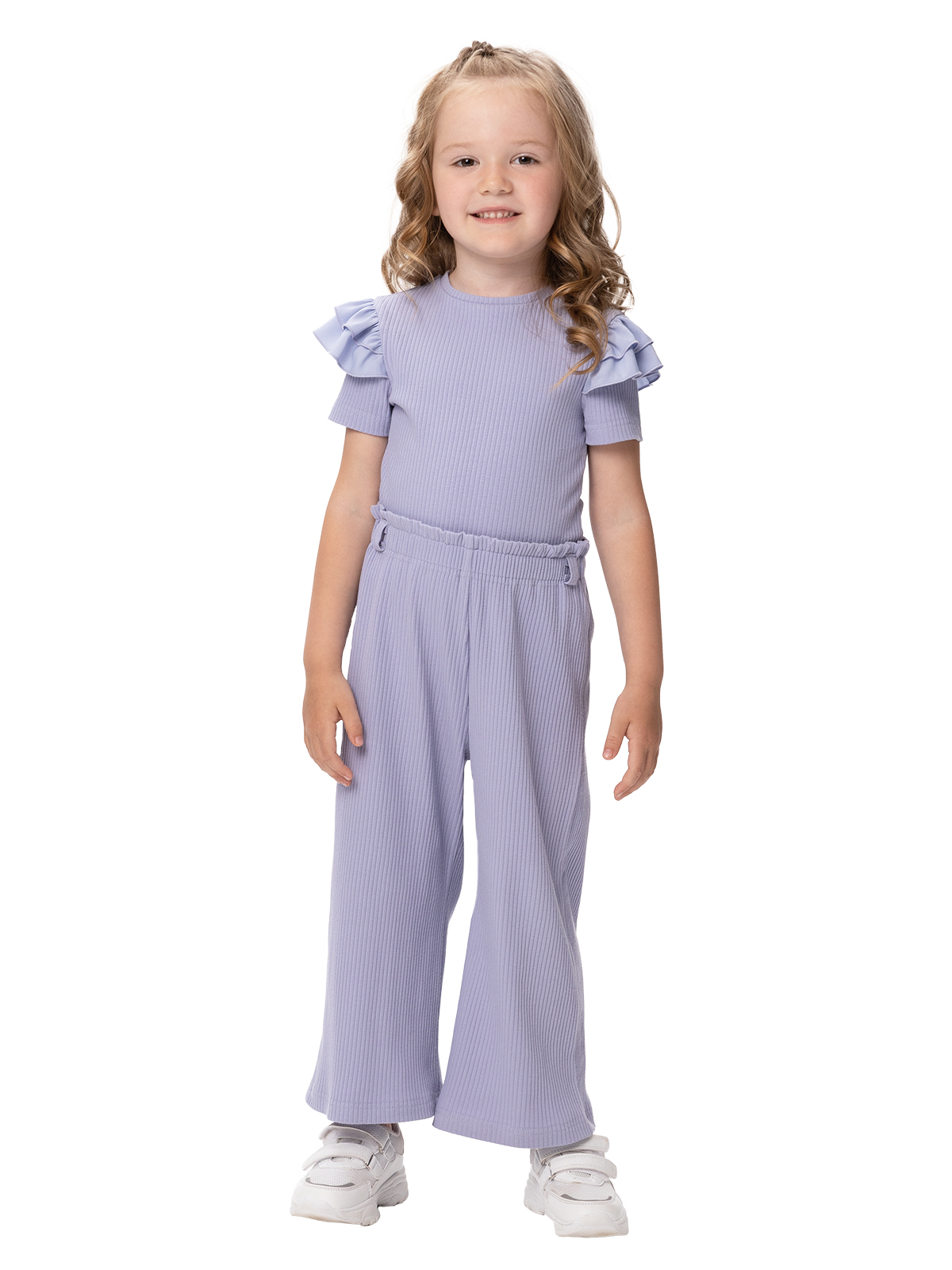Джемпер из фактурного трикотажа, короткие рукава, в пройму вставлено два ряда оборок из шифона, по горловине притачивается бейка.