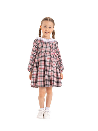 Платье из тонкого трикотажа с дизайнерским принтом, заниженная линия талии, юбка из смесового фактурного трикотажа со сборкой, на линии талии металлическое украшение, круглый воротник, длинные рукава с широкими притачными деталями со сборкой, по низу рукавов эластичная линия, на спинке средний шов, застежка разрез с пуговицей.