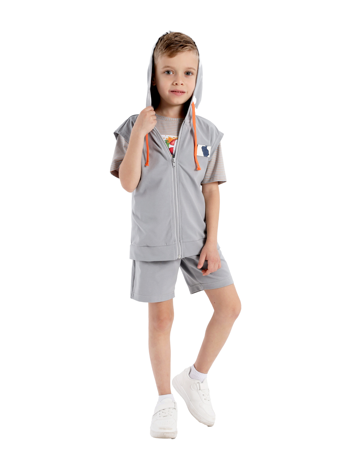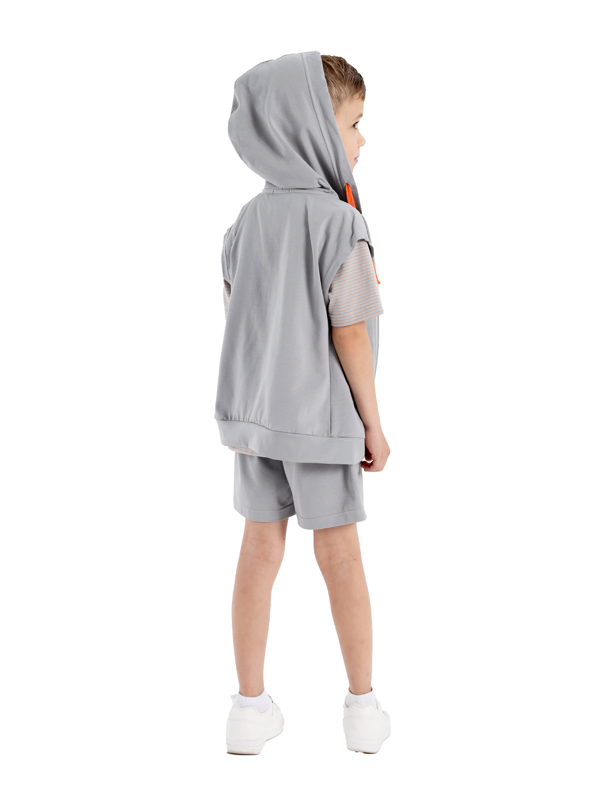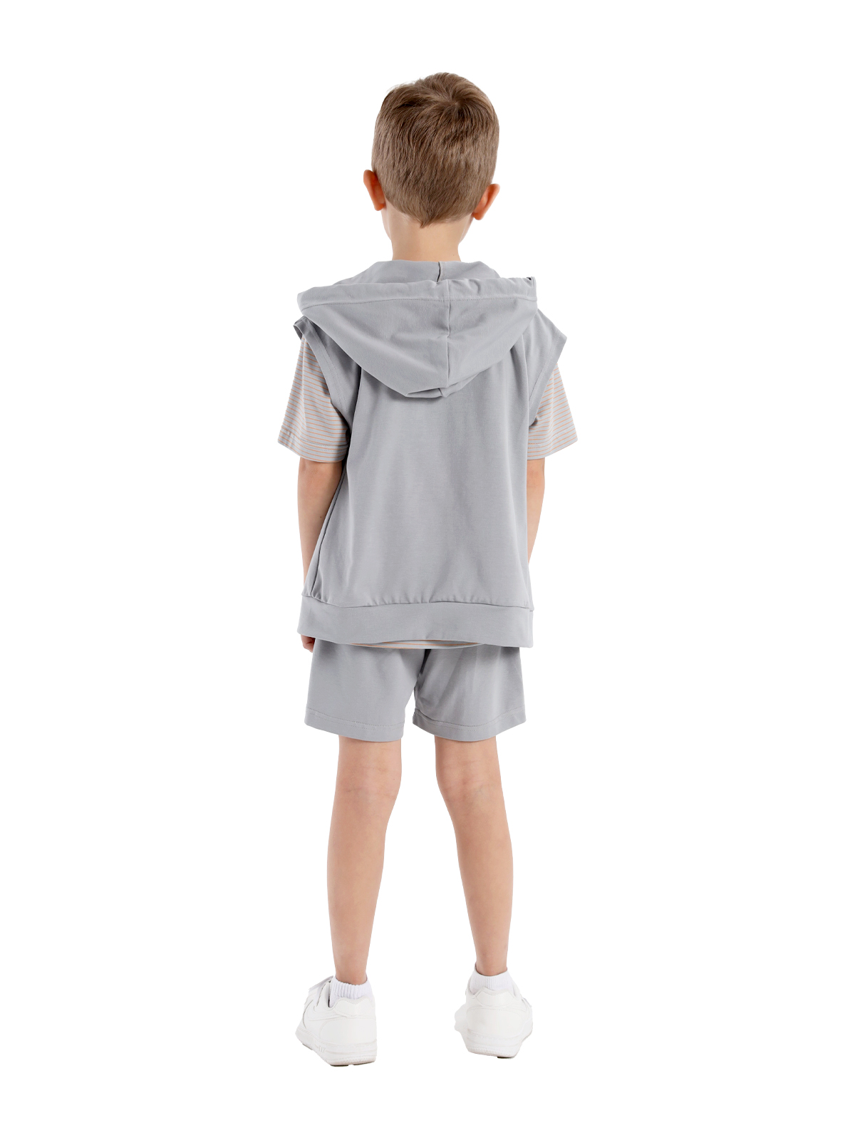 Комплект из тонкого трикотаж, состоящий из жилета, джемпера и шорт; жилет с капюшоном, шнурок, застежка на молнию, на полочке нашивка, к низу изделия притачивается пояс; джемпер с короткими рукавами, спущенное плечо, по горловине притачивается бейка, на полочке нашивка; шорты с притачным поясом с внутренней эластичной лентой и шнурком, на передних половинках карманы с отрезными деталями.