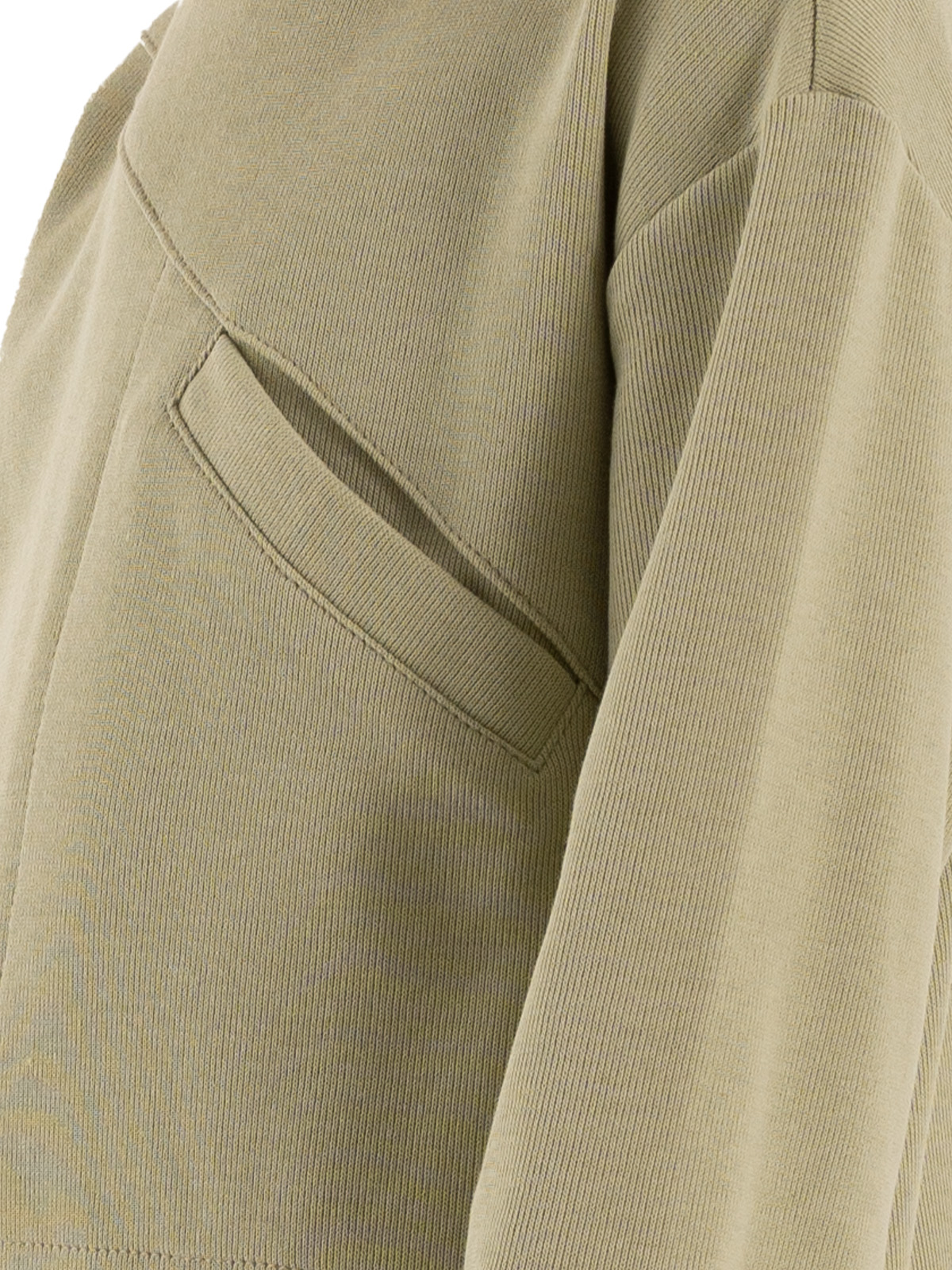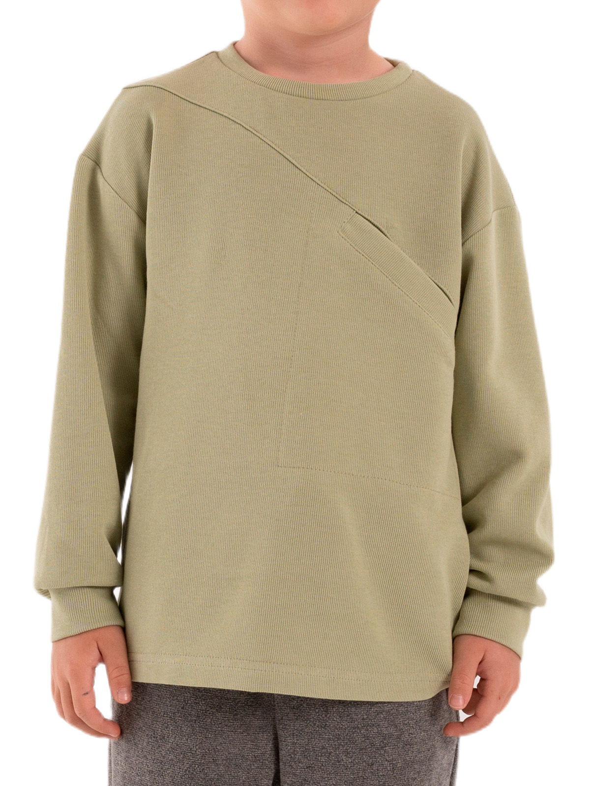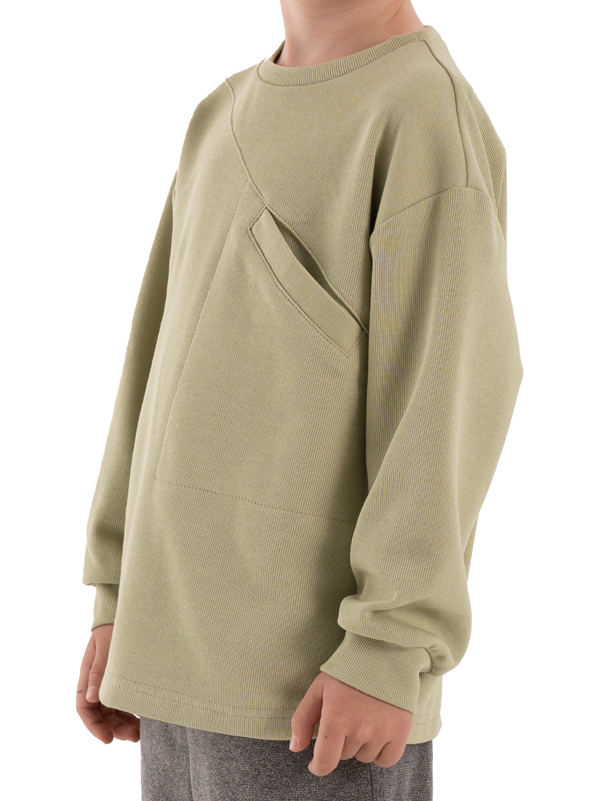 Джемпер из плотного трикотажа, спущенное плечо, длинные рукава с притачными манжетами, по горловине притачивается бейка, на полочке подрез и карман.