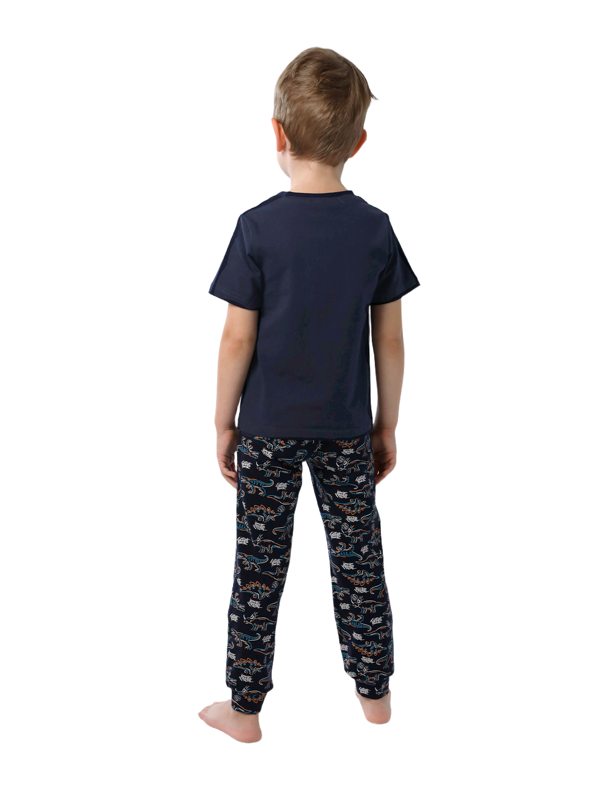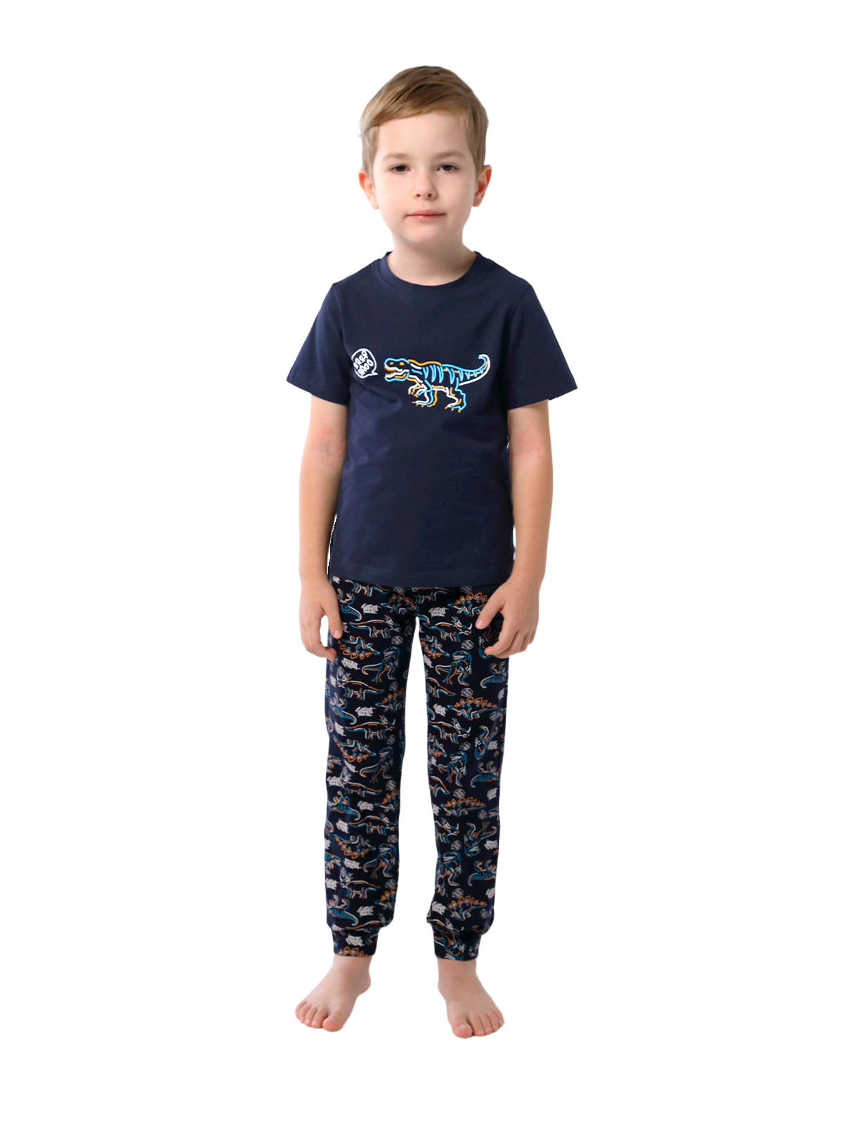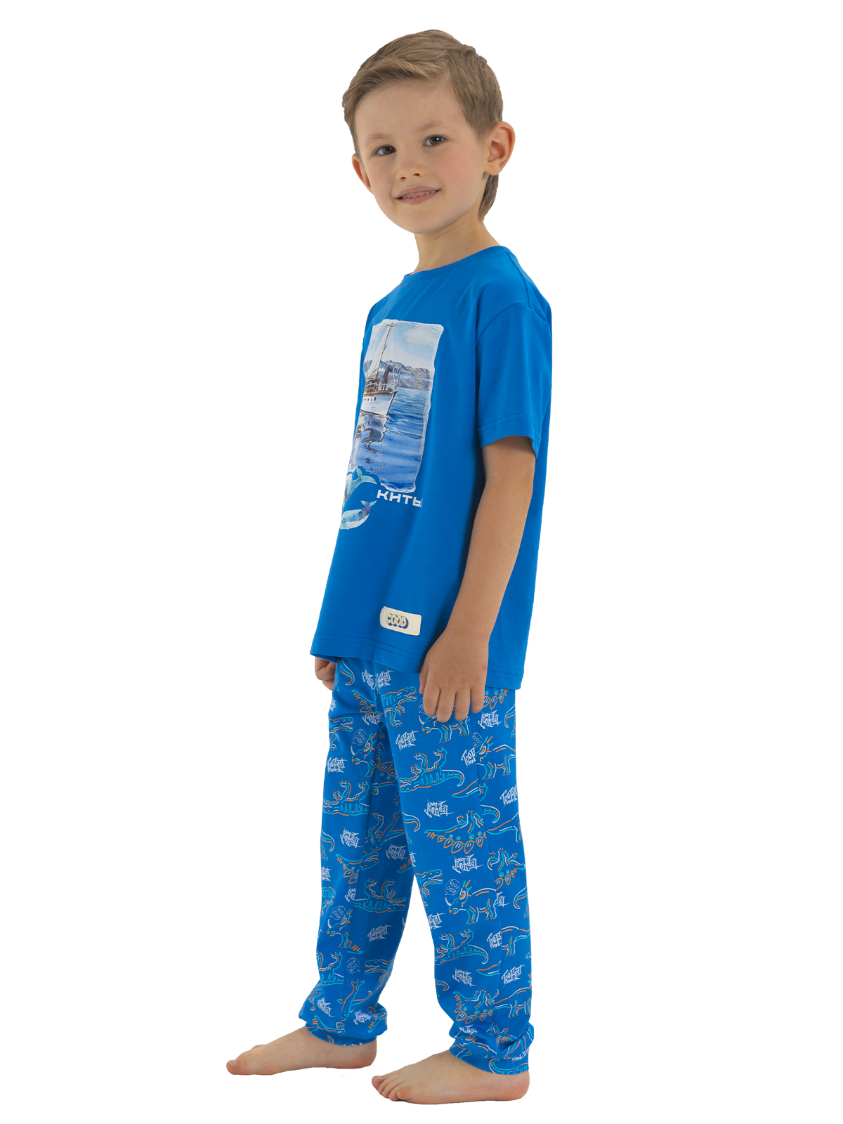 Пижама для мальчика из тонкого трикотажа, джемпер с короткими рукавами, по горловине притачивается бейка, на полочке принт, свободные брюки с внутренней эластичной лентой, по низу брюк притачные манжеты.