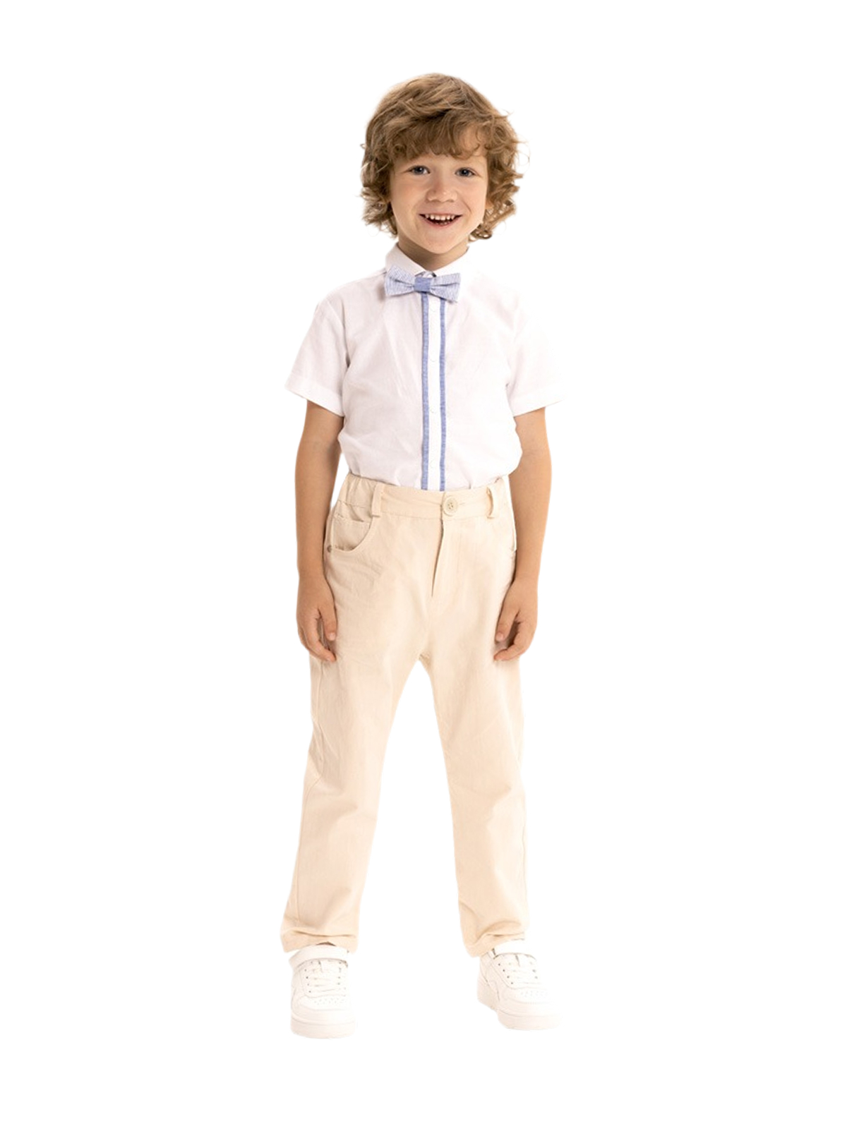 Рубашка из хлопка с застежкой на кнопках, короткие рукава, воротник на стойке, планка с кантами, на спинке кокетка, съемная бабочка.
