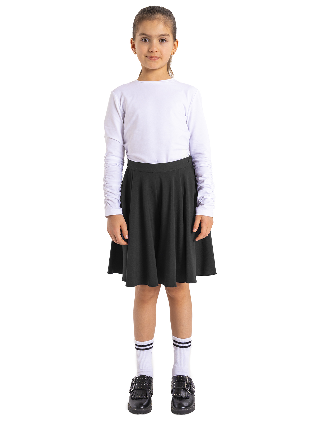 Юбка-шорты из костюмной ткани с мягкими заложенными складками, силуэт «солнце», в левом боковом шве застежка на пуговицу и молнию, притачной пояс, на спинке в поясе есть регулировка размера с помощью внутренней эластичной ленты на пуговице.