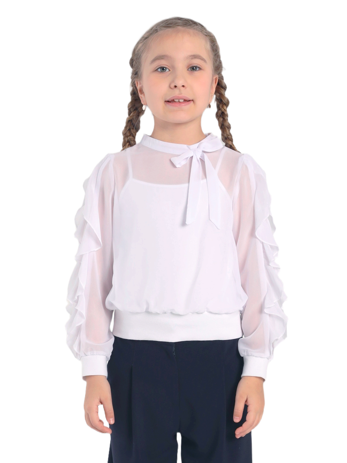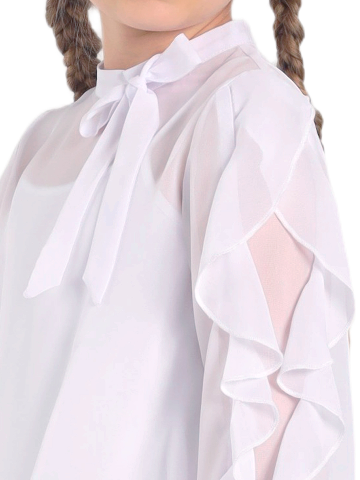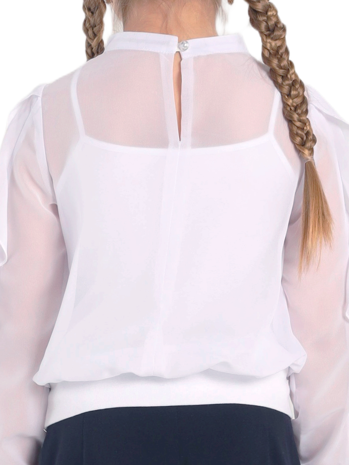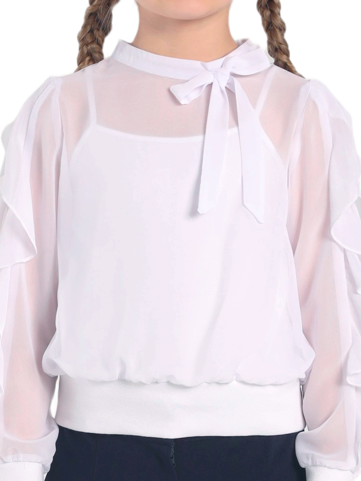 Блузка из шифона, под шифоновым верхом трикотажная майка, длинные рукава с воланами, притачные трикотажные манжеты, воротник стойка, к правой стороне пришита шифоновая лента, на спинке средний шов разрез с застежкой на пуговицу, к низу изделия притачивается трикотажный пояс.
