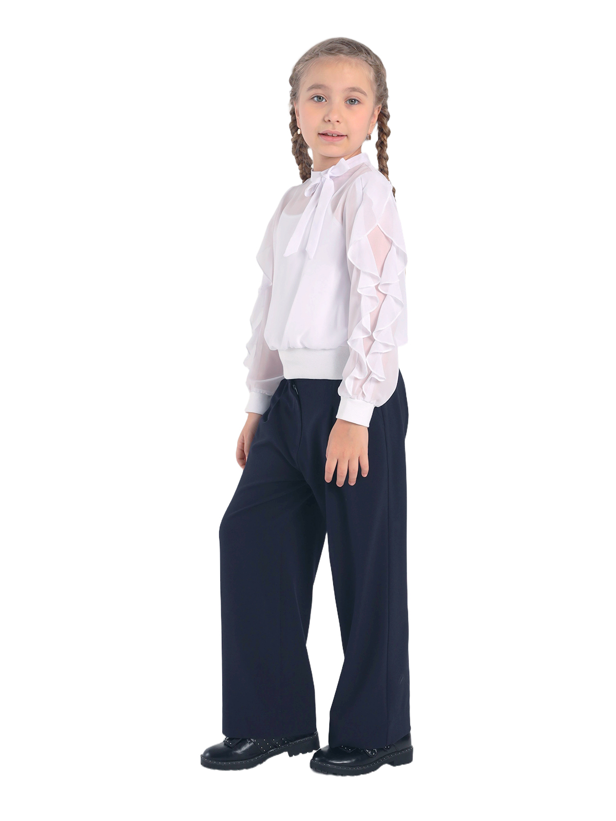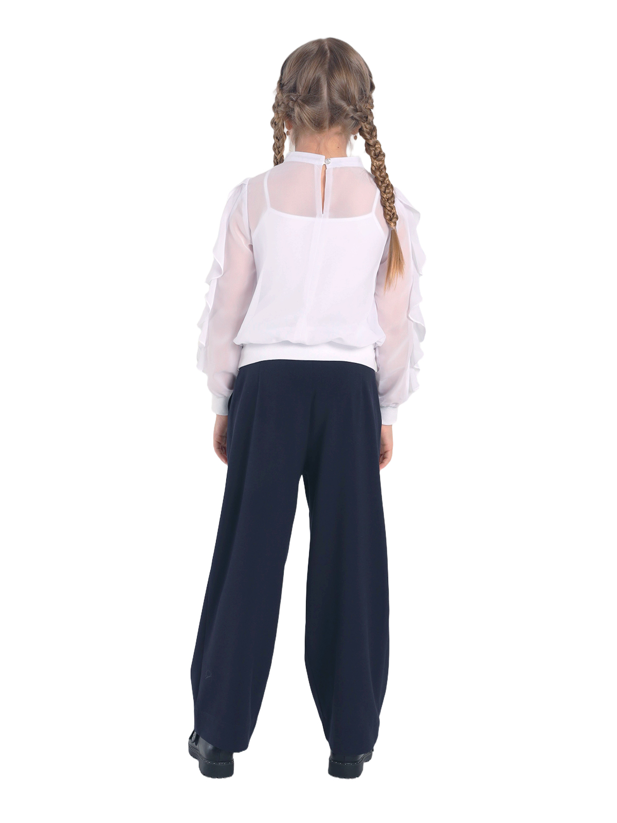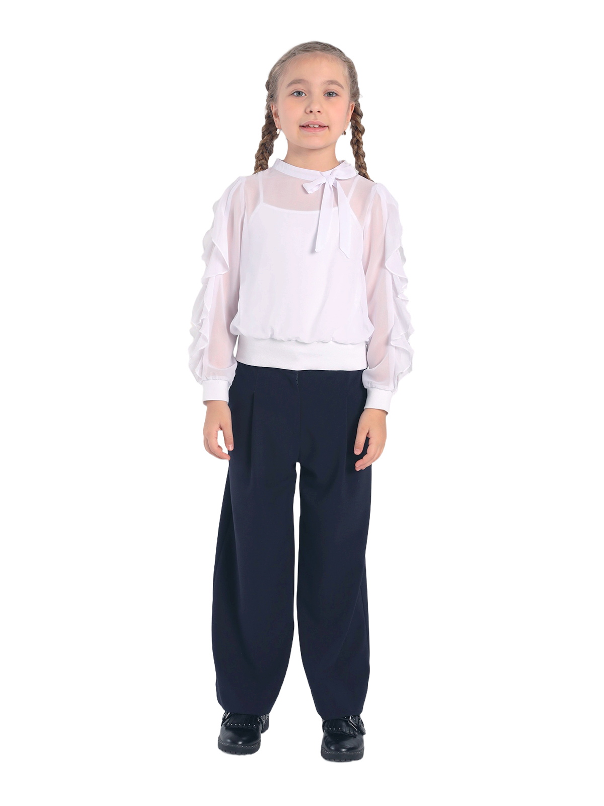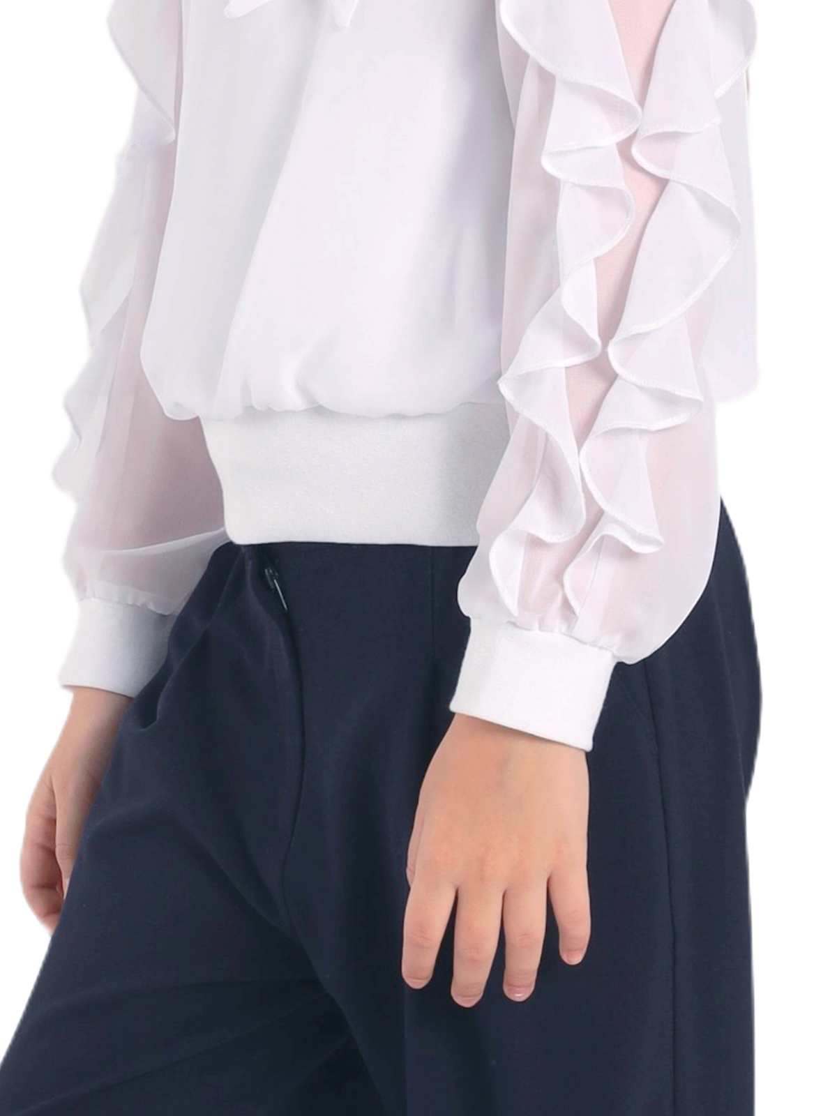 Блузка из шифона, под шифоновым верхом трикотажная майка, длинные рукава с воланами, притачные трикотажные манжеты, воротник стойка, к правой стороне пришита шифоновая лента, на спинке средний шов разрез с застежкой на пуговицу, к низу изделия притачивается трикотажный пояс.