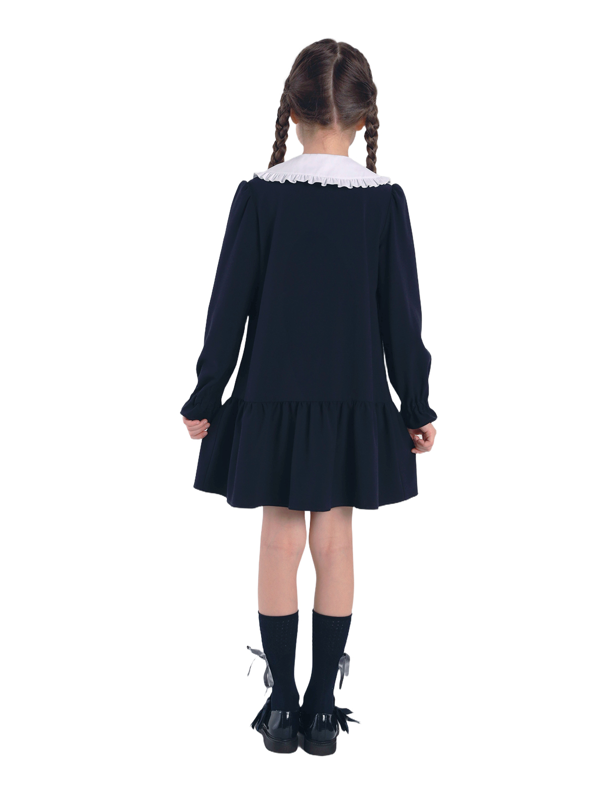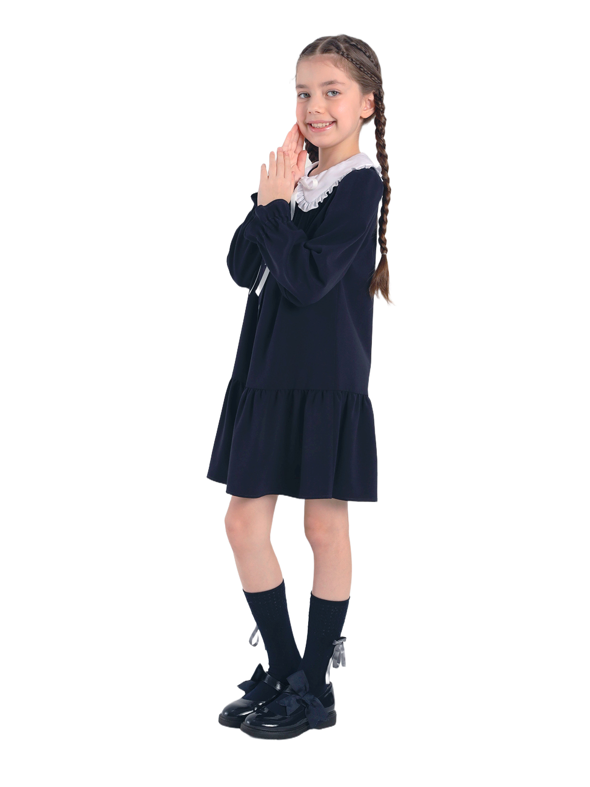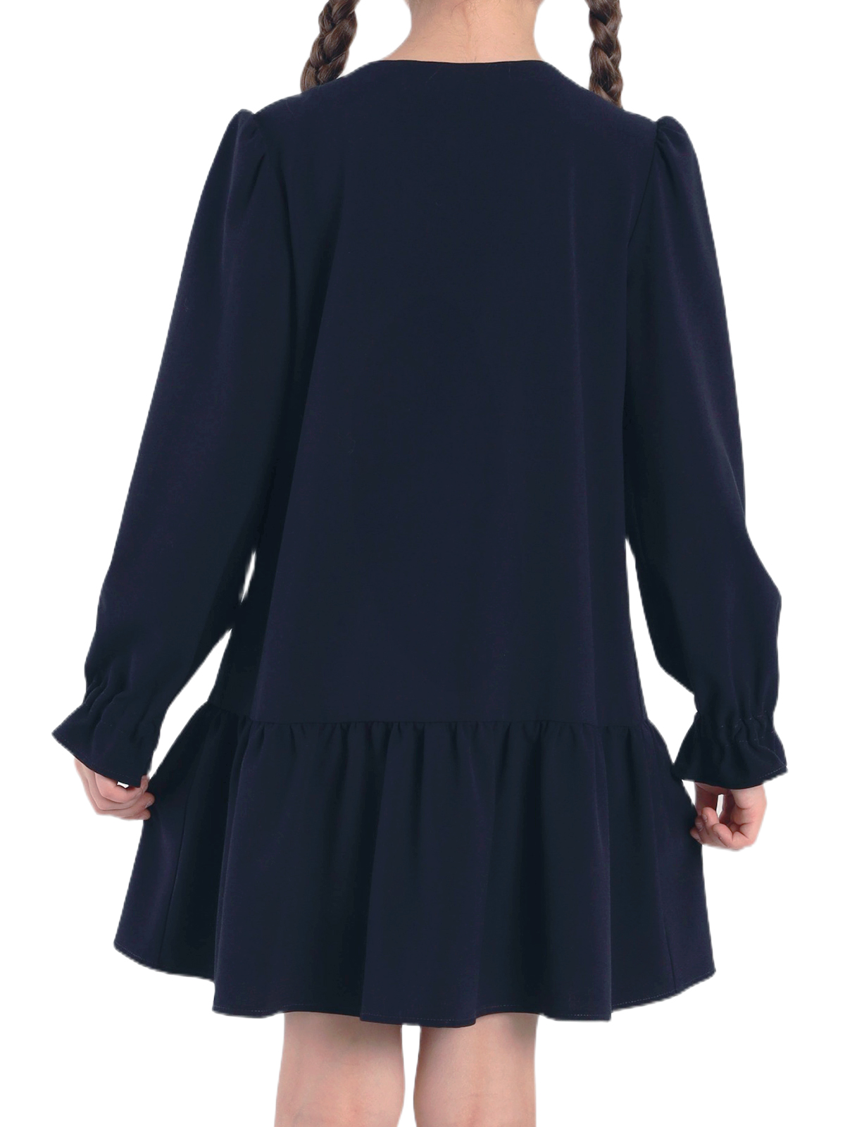 Платье - рубашка из костюмной ткани с длинными рукавами со сборкой, на некотором расстоянии от низа рукавов кулиса с эластичной лентой, съемный воротник с оборкой, декоративный съемный бант - галстук, на полочке застроченные складки, застежка на кнопки, по низу изделия притачивается широкая оборка.