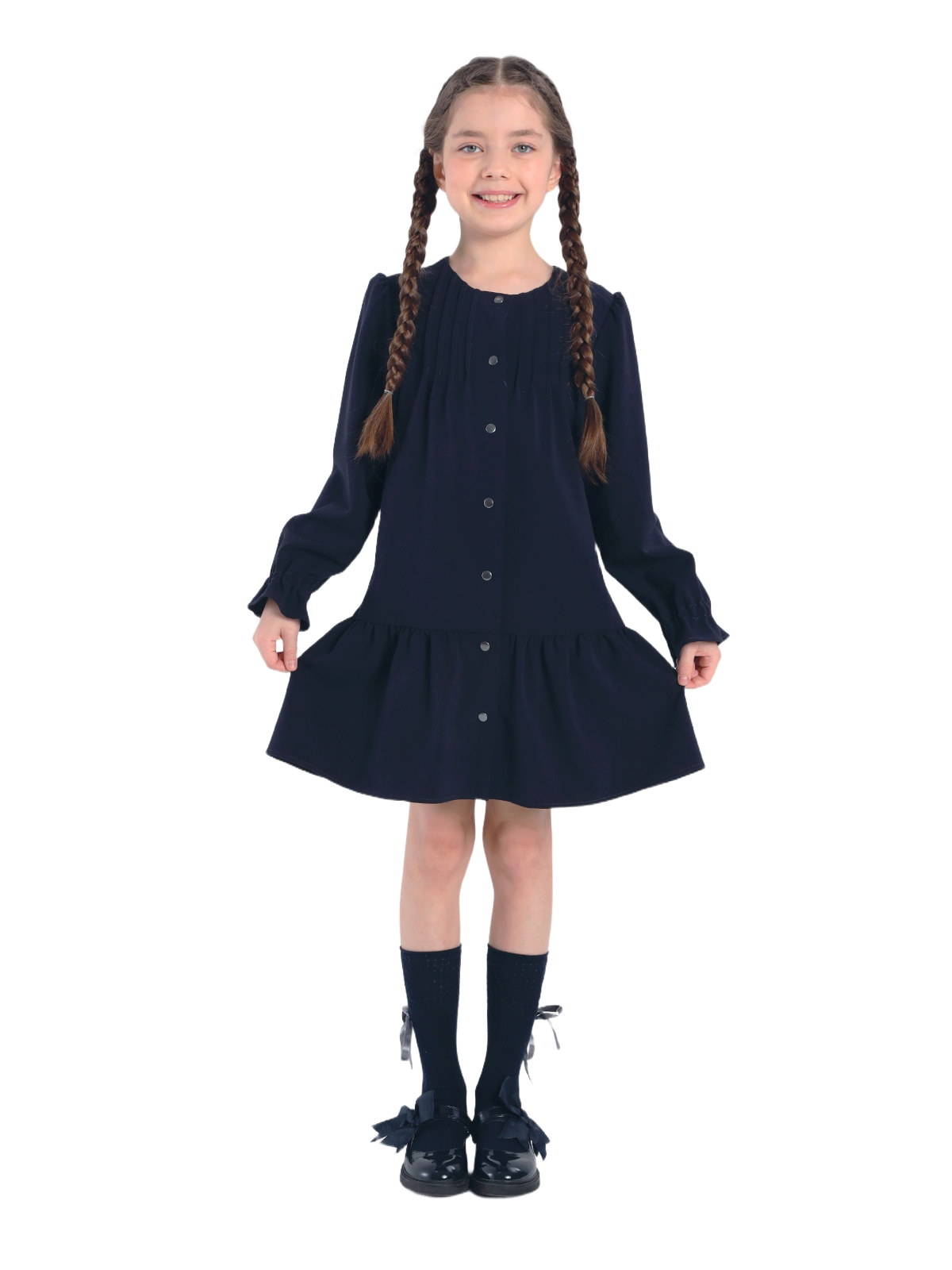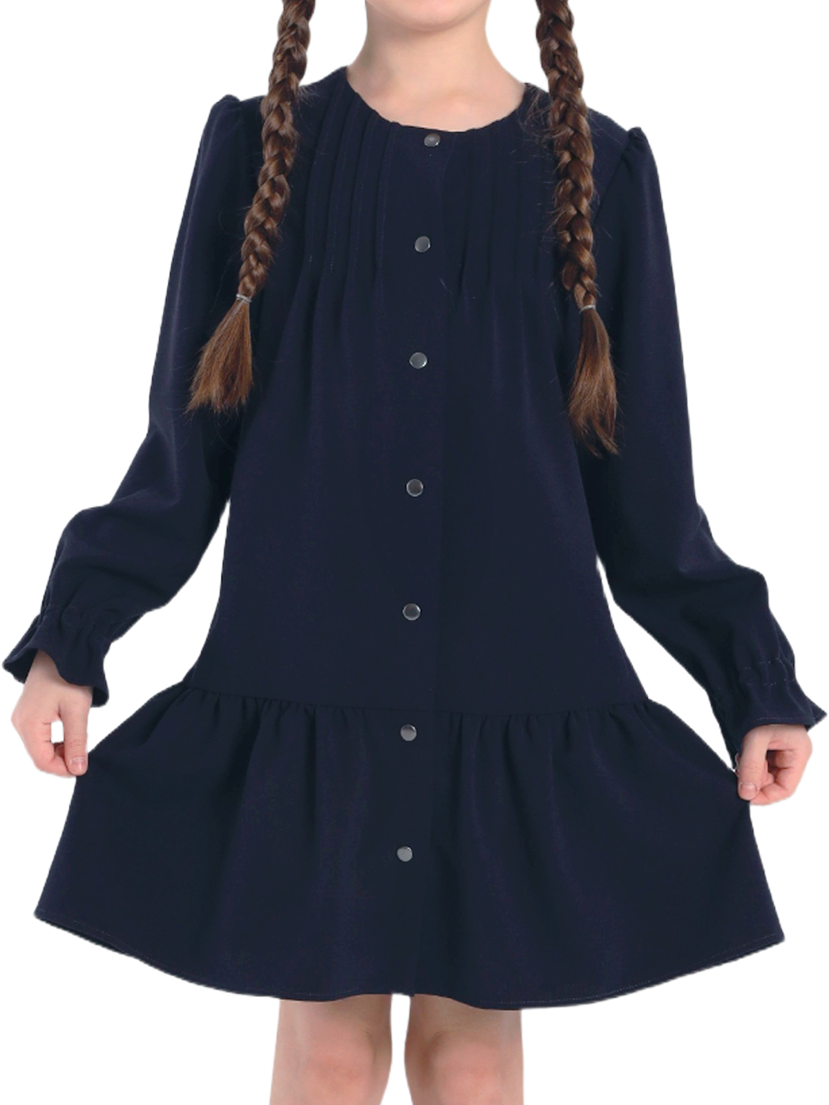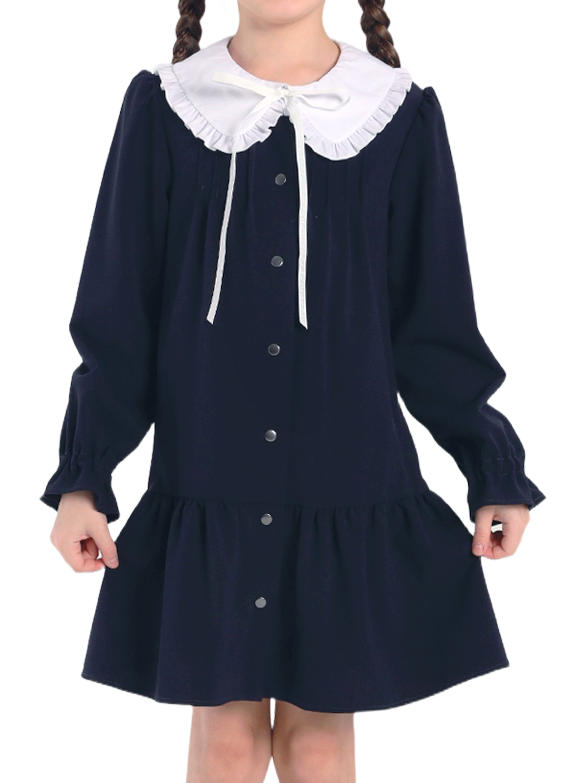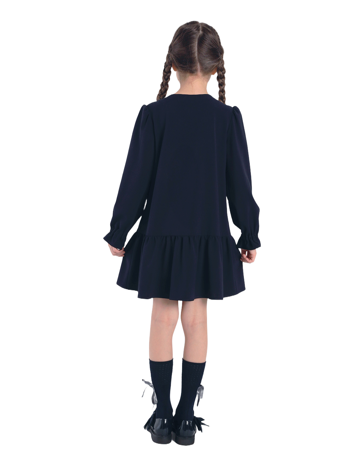 Платье - рубашка из костюмной ткани с длинными рукавами со сборкой, на некотором расстоянии от низа рукавов кулиса с эластичной лентой, съемный воротник с оборкой, декоративный съемный бант - галстук, на полочке застроченные складки, застежка на кнопки, по низу изделия притачивается широкая оборка.