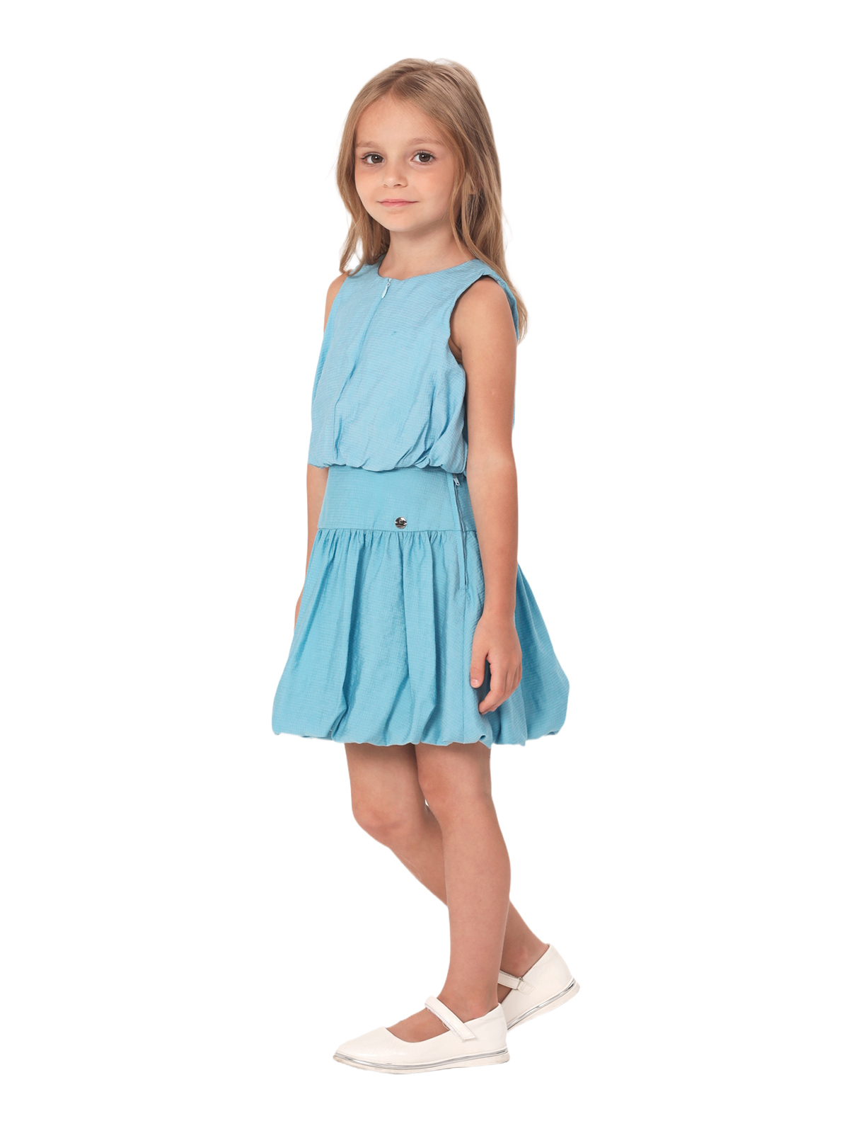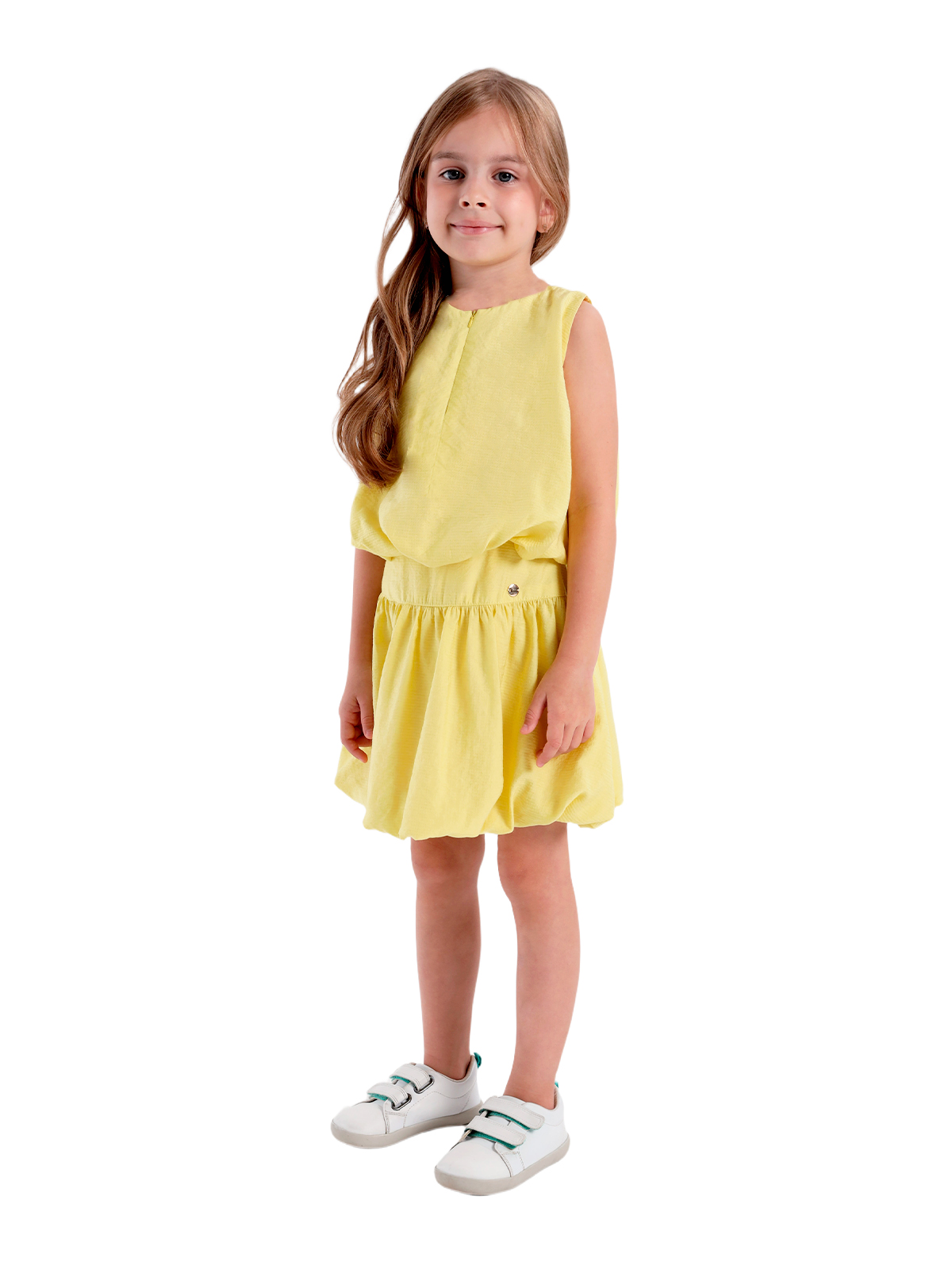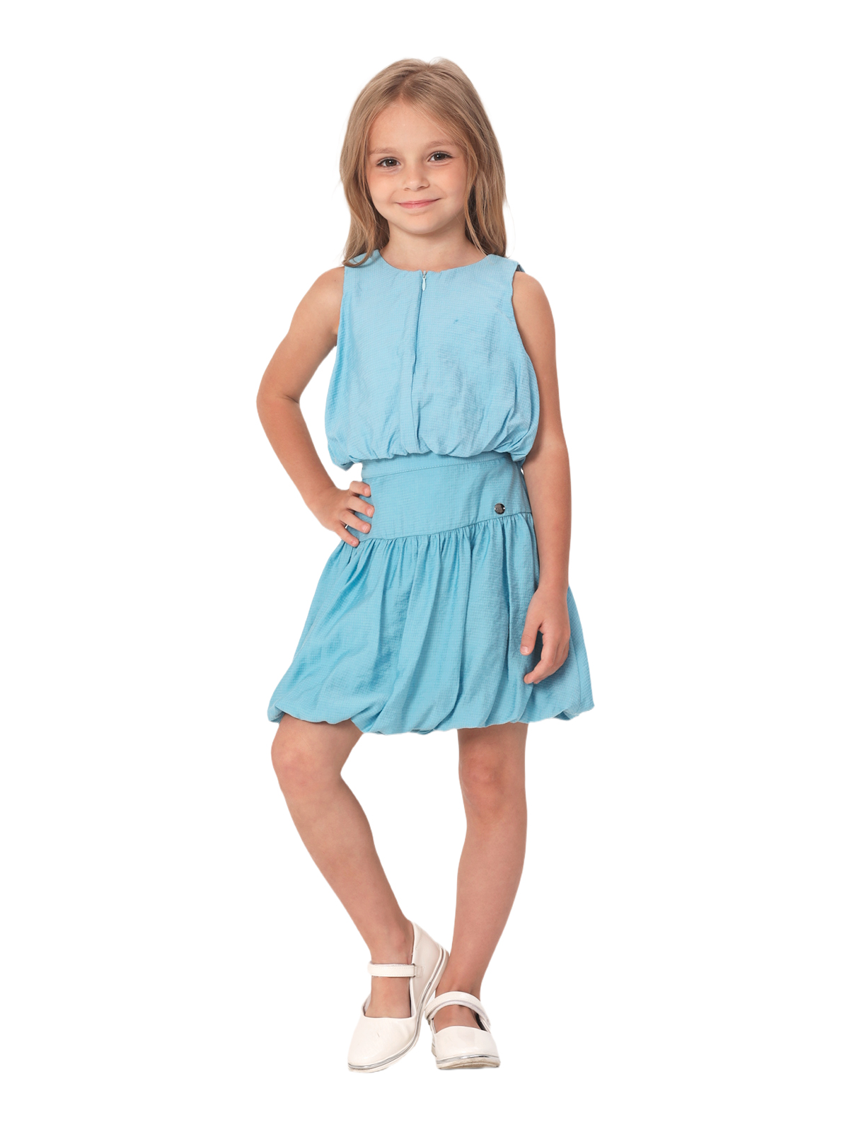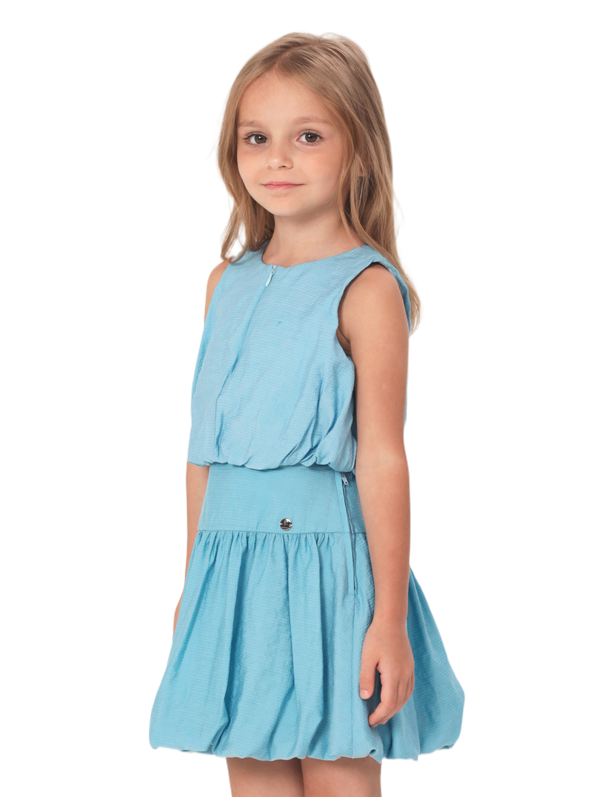 Комплект из легкой ткани, блузка баллон на подкладке, на полочке застежка на молнию, круглая горловина, юбка с притачным поясом, в поясе есть регулировка размера с помощью эластичной ленты на пуговицу, в боковом шве застежка на молнию, кокетка, нижняя часть юбки-баллон, изделие на подкладке. Подкладка 100% хлопок.