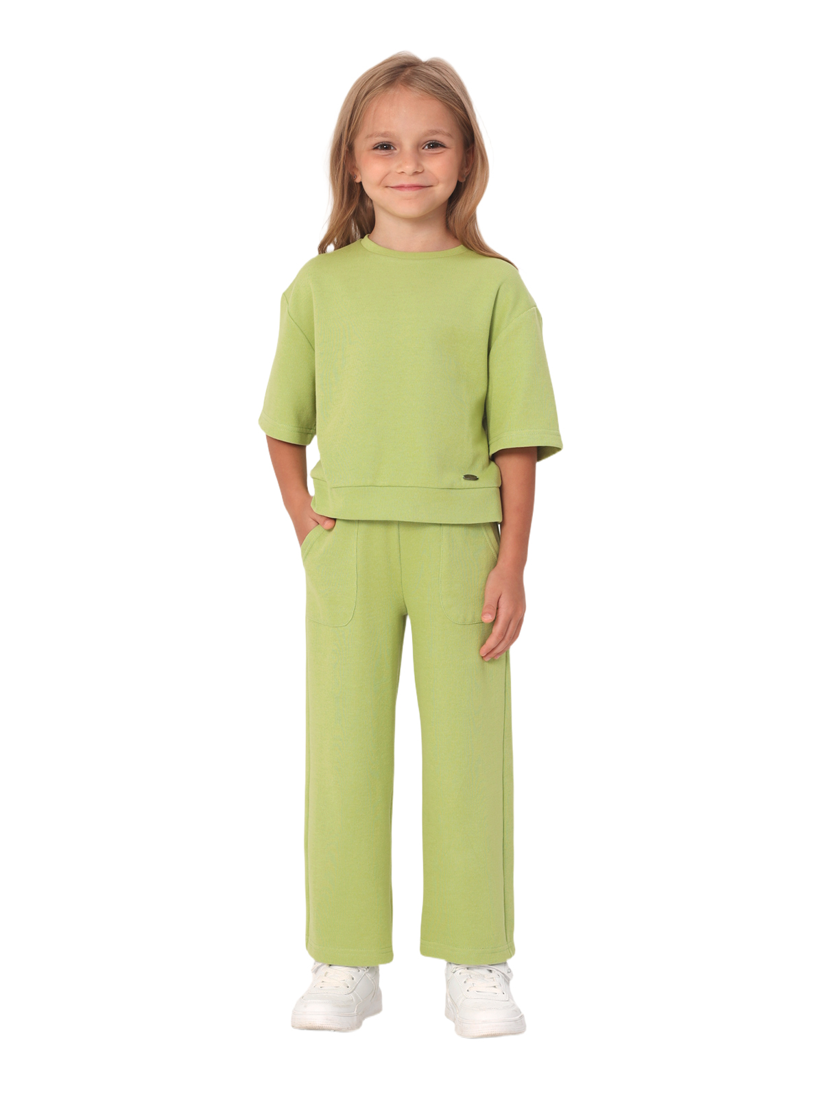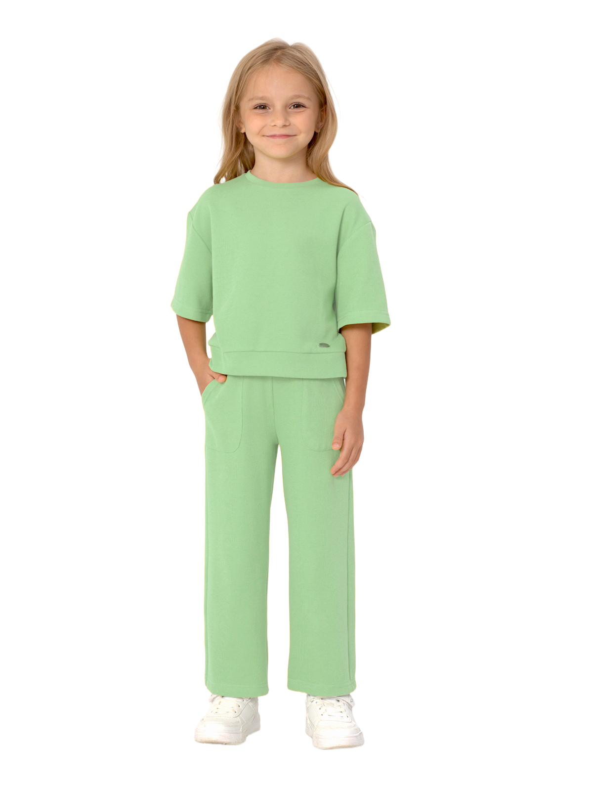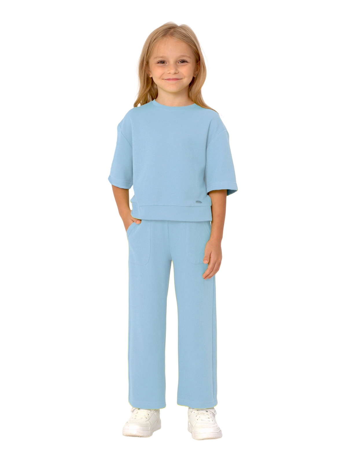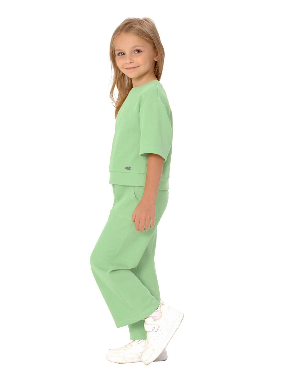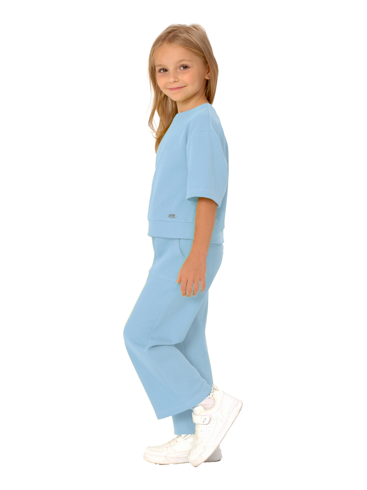 Комплект из джемпера и брюк из плотного фактурного трикотажа, укороченный джемпер оверсайз со спущенным плечом, короткие рукава, по горловине притачивается бейка, к низу притачивается пояс, на полочке металлическое украшение с логотипом, свободные брюки с притачным поясом с эластичной лентой, на передних половинках накладные карманы.