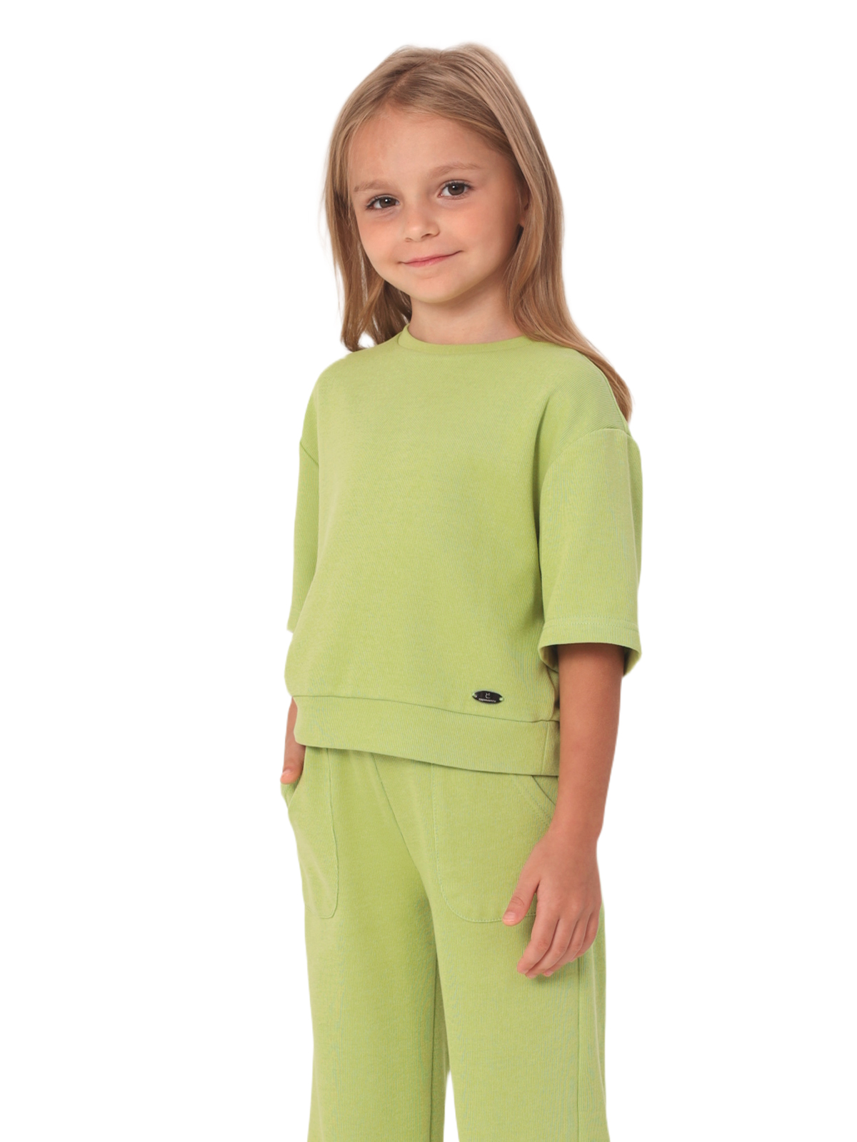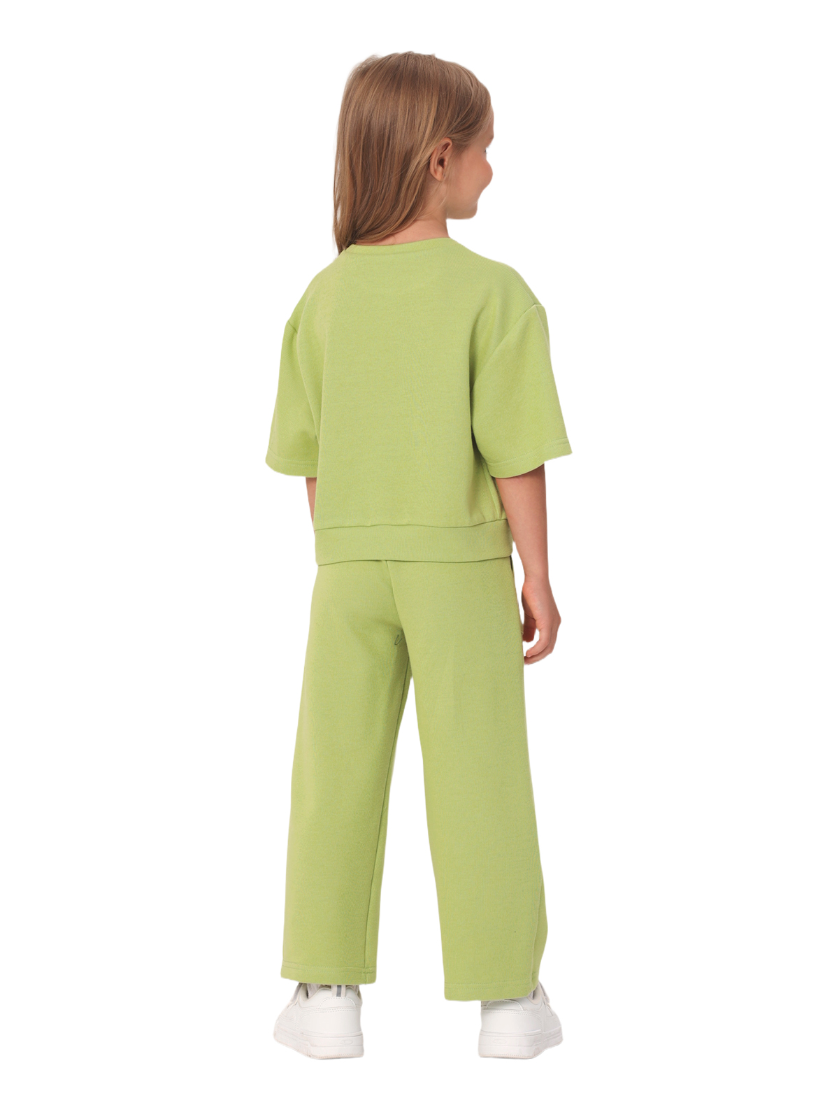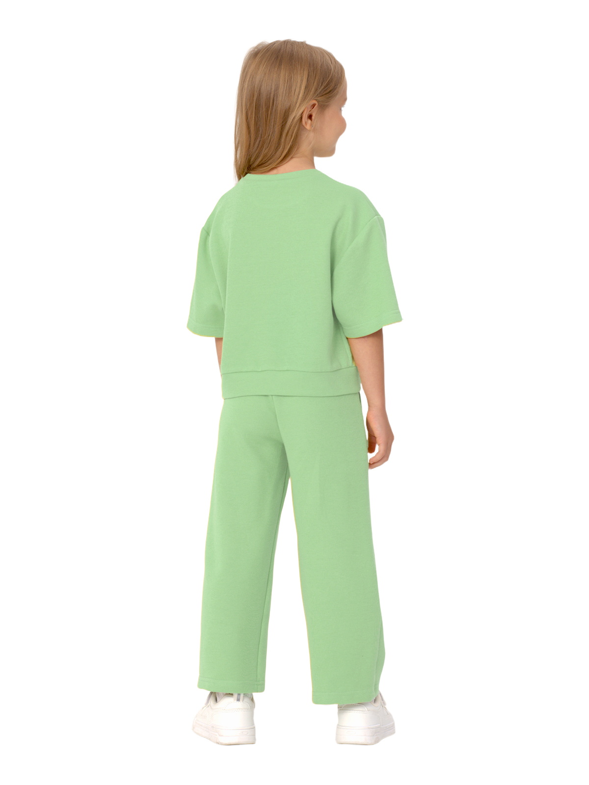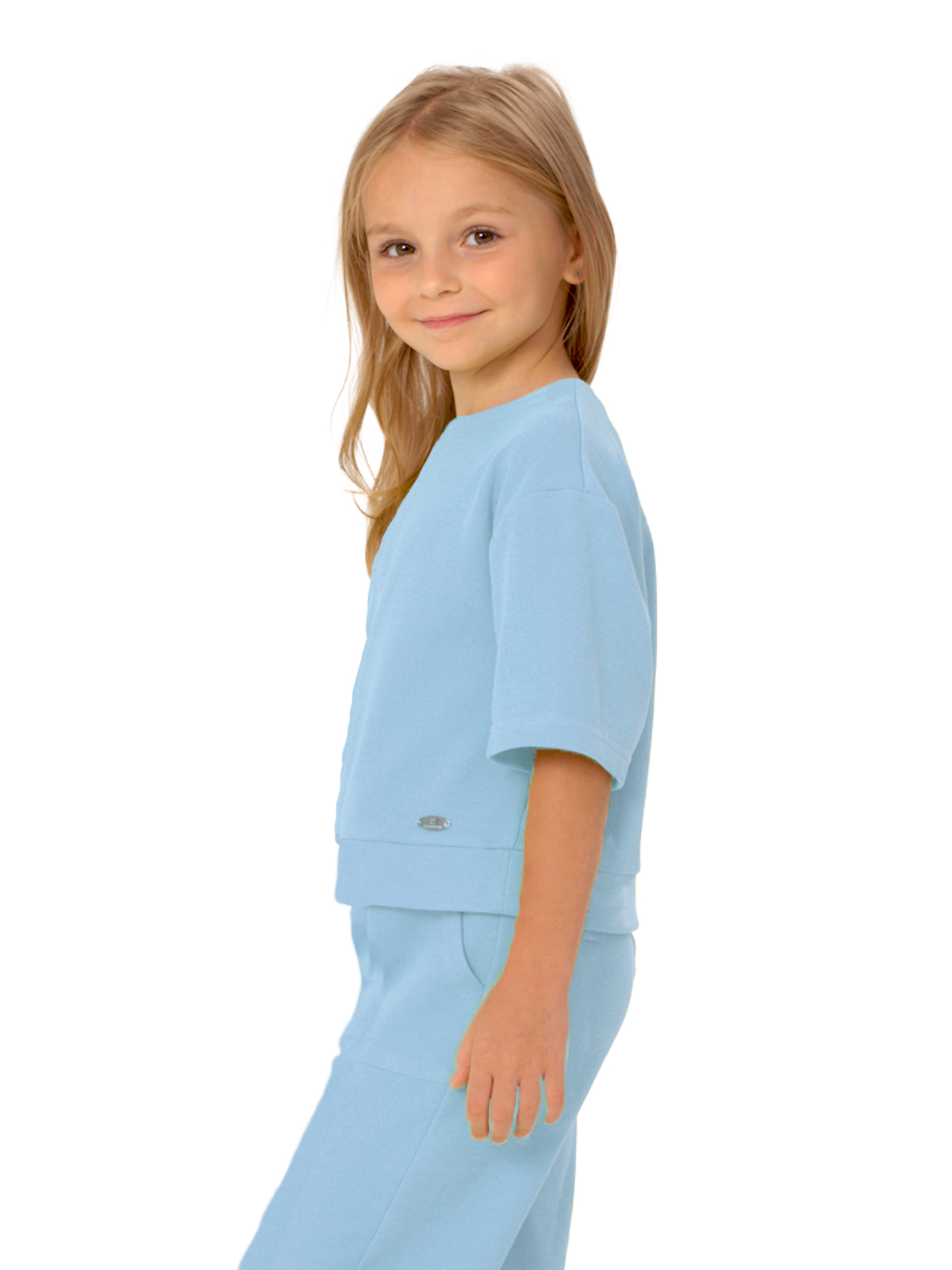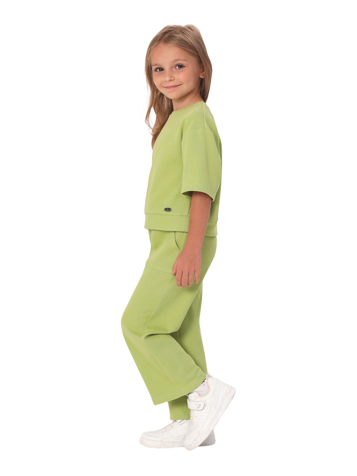 Комплект из джемпера и брюк из плотного фактурного трикотажа, укороченный джемпер оверсайз со спущенным плечом, короткие рукава, по горловине притачивается бейка, к низу притачивается пояс, на полочке металлическое украшение с логотипом, свободные брюки с притачным поясом с эластичной лентой, на передних половинках накладные карманы.