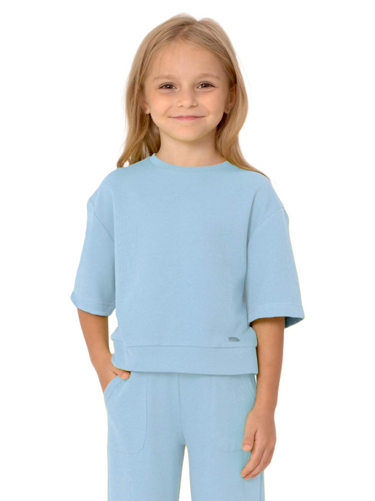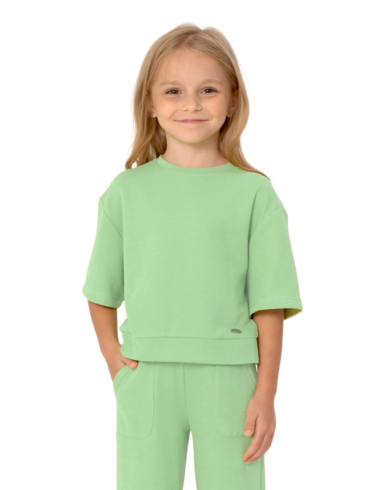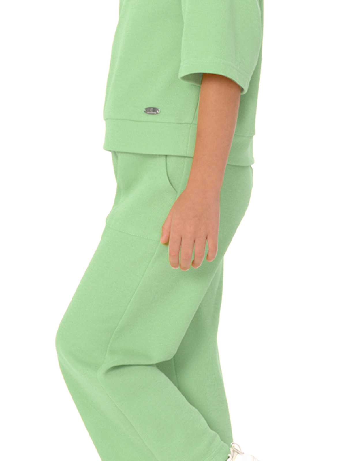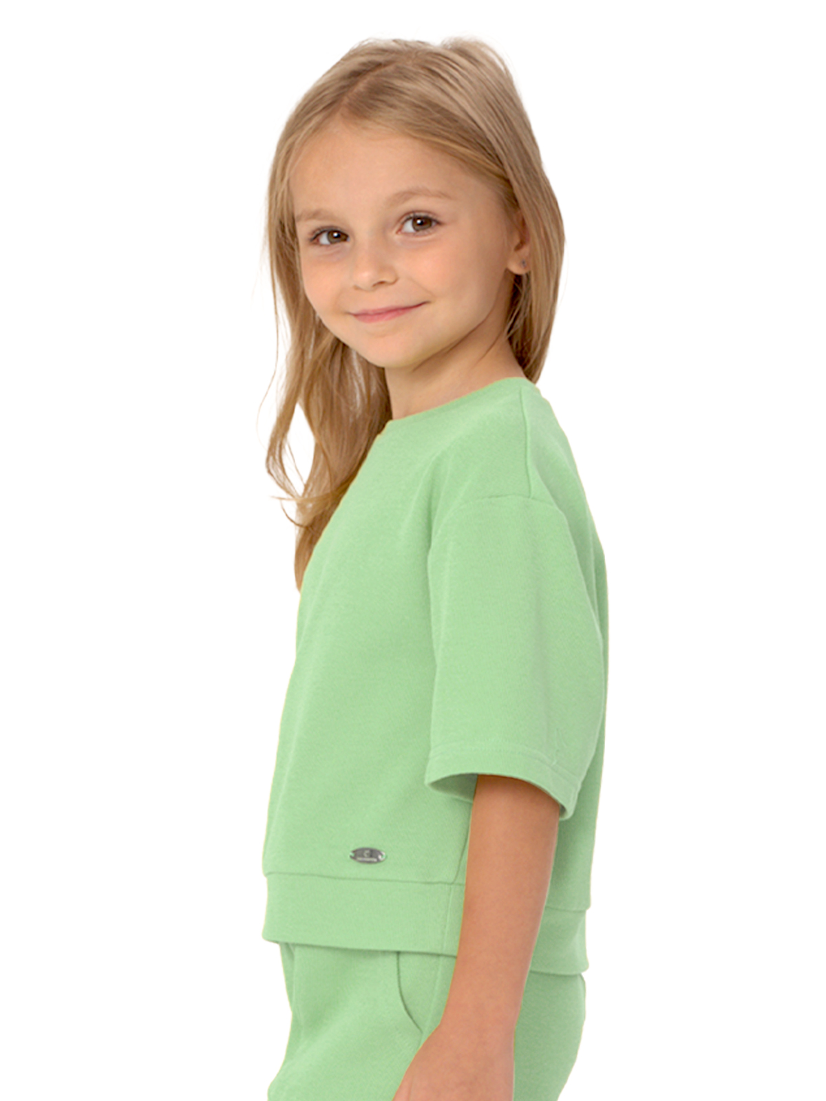 Комплект из джемпера и брюк из плотного фактурного трикотажа, укороченный джемпер оверсайз со спущенным плечом, короткие рукава, по горловине притачивается бейка, к низу притачивается пояс, на полочке металлическое украшение с логотипом, свободные брюки с притачным поясом с эластичной лентой, на передних половинках накладные карманы.