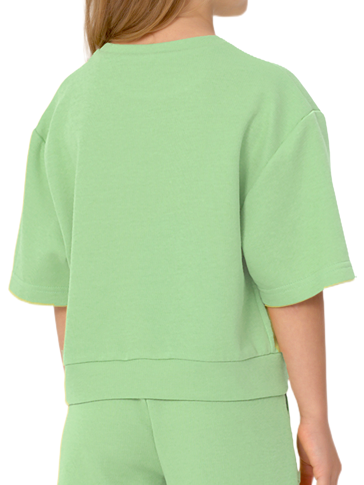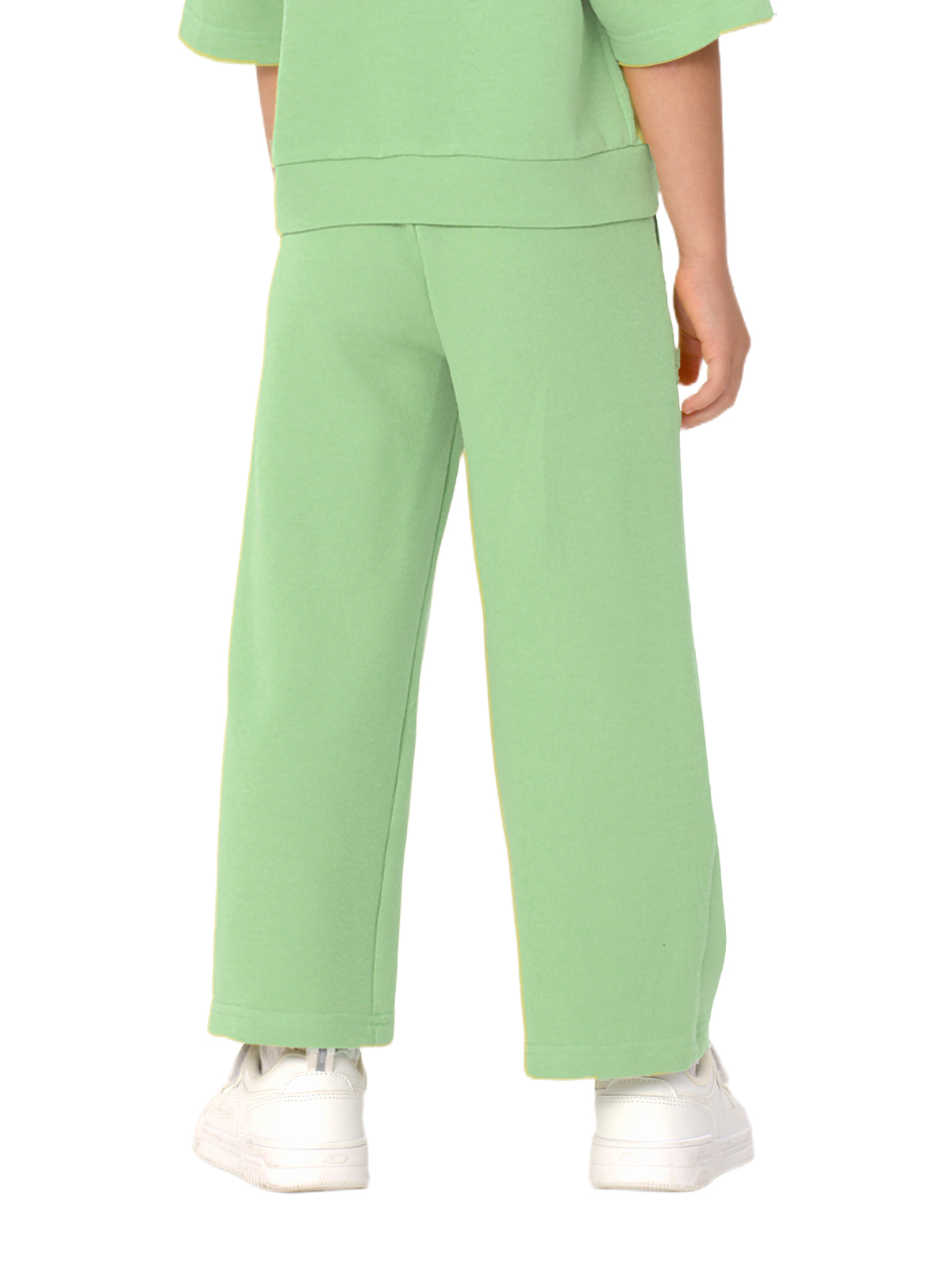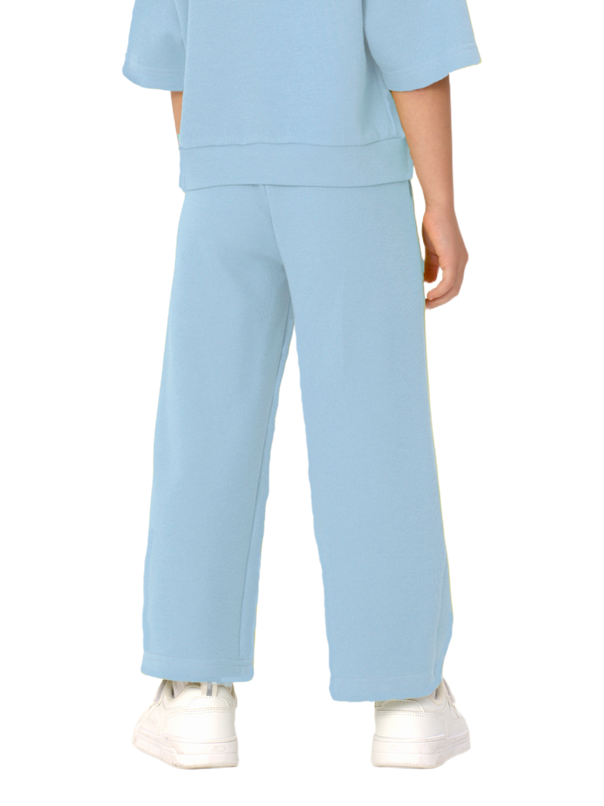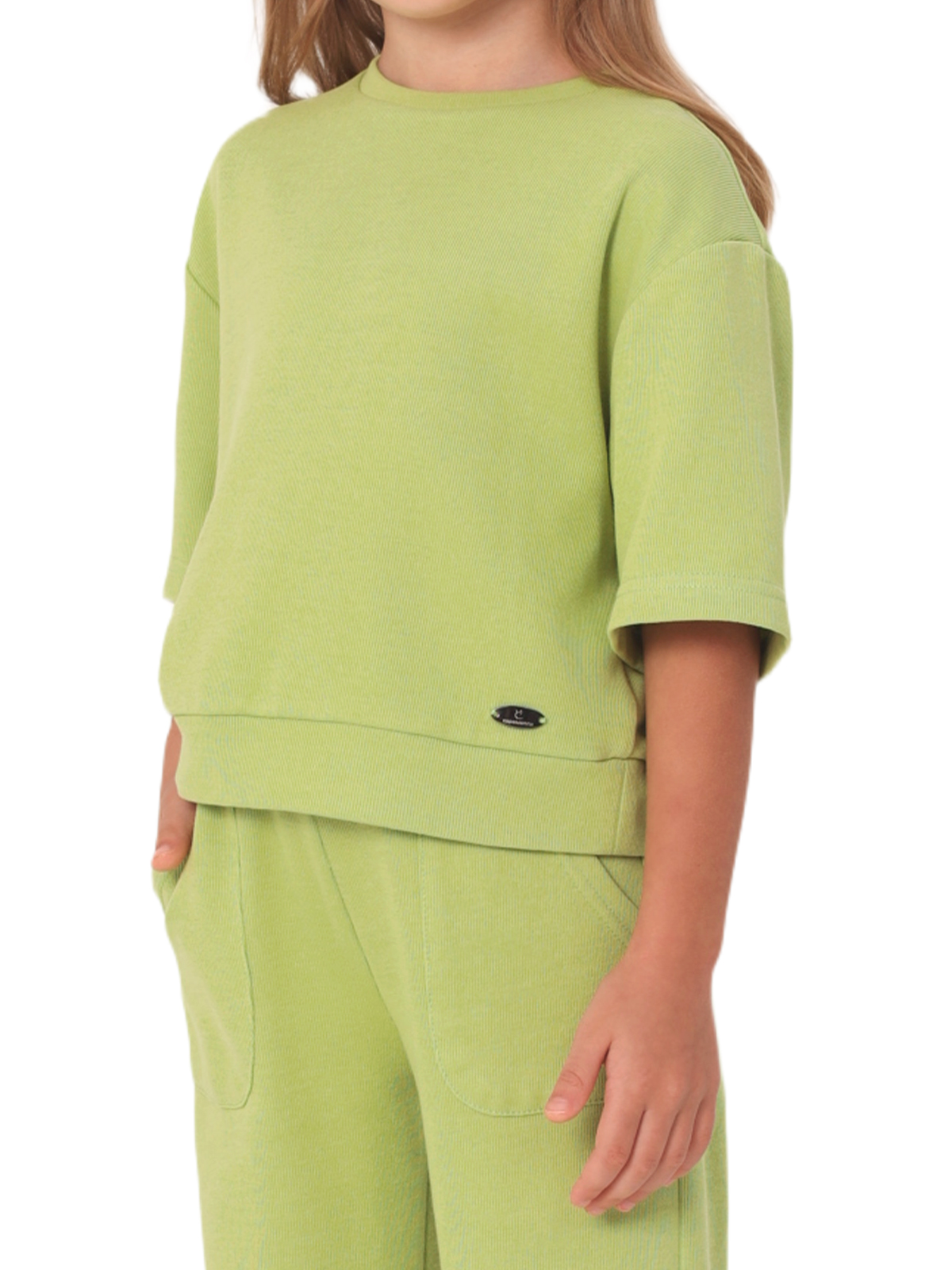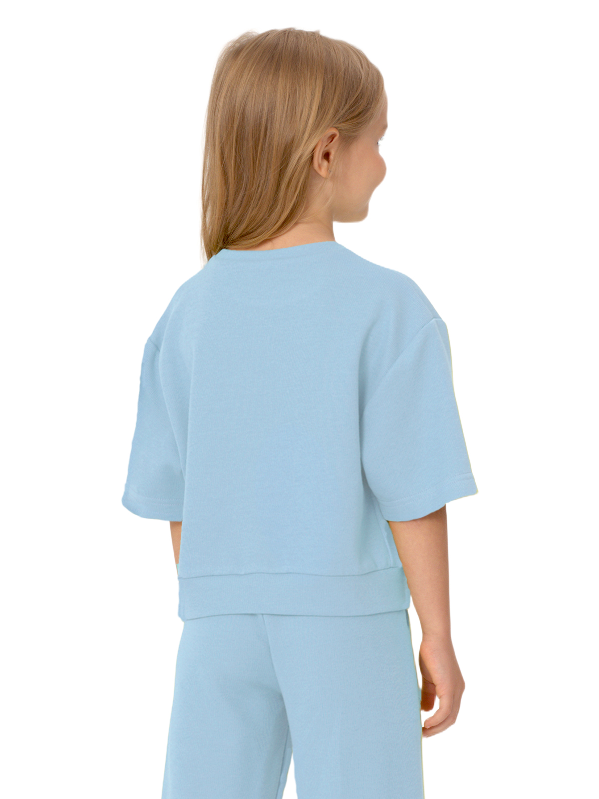 Комплект из джемпера и брюк из плотного фактурного трикотажа, укороченный джемпер оверсайз со спущенным плечом, короткие рукава, по горловине притачивается бейка, к низу притачивается пояс, на полочке металлическое украшение с логотипом, свободные брюки с притачным поясом с эластичной лентой, на передних половинках накладные карманы.