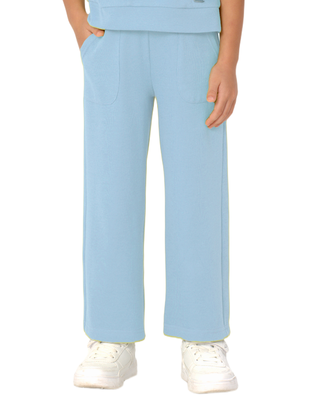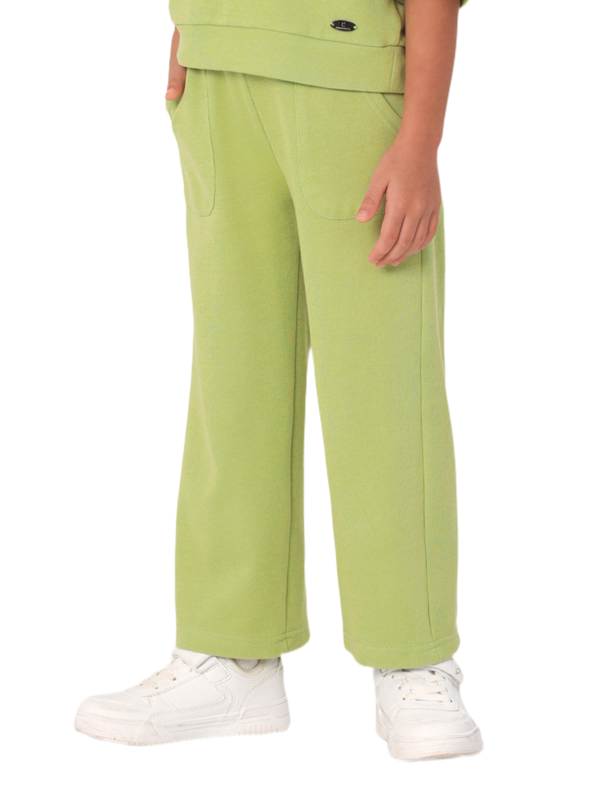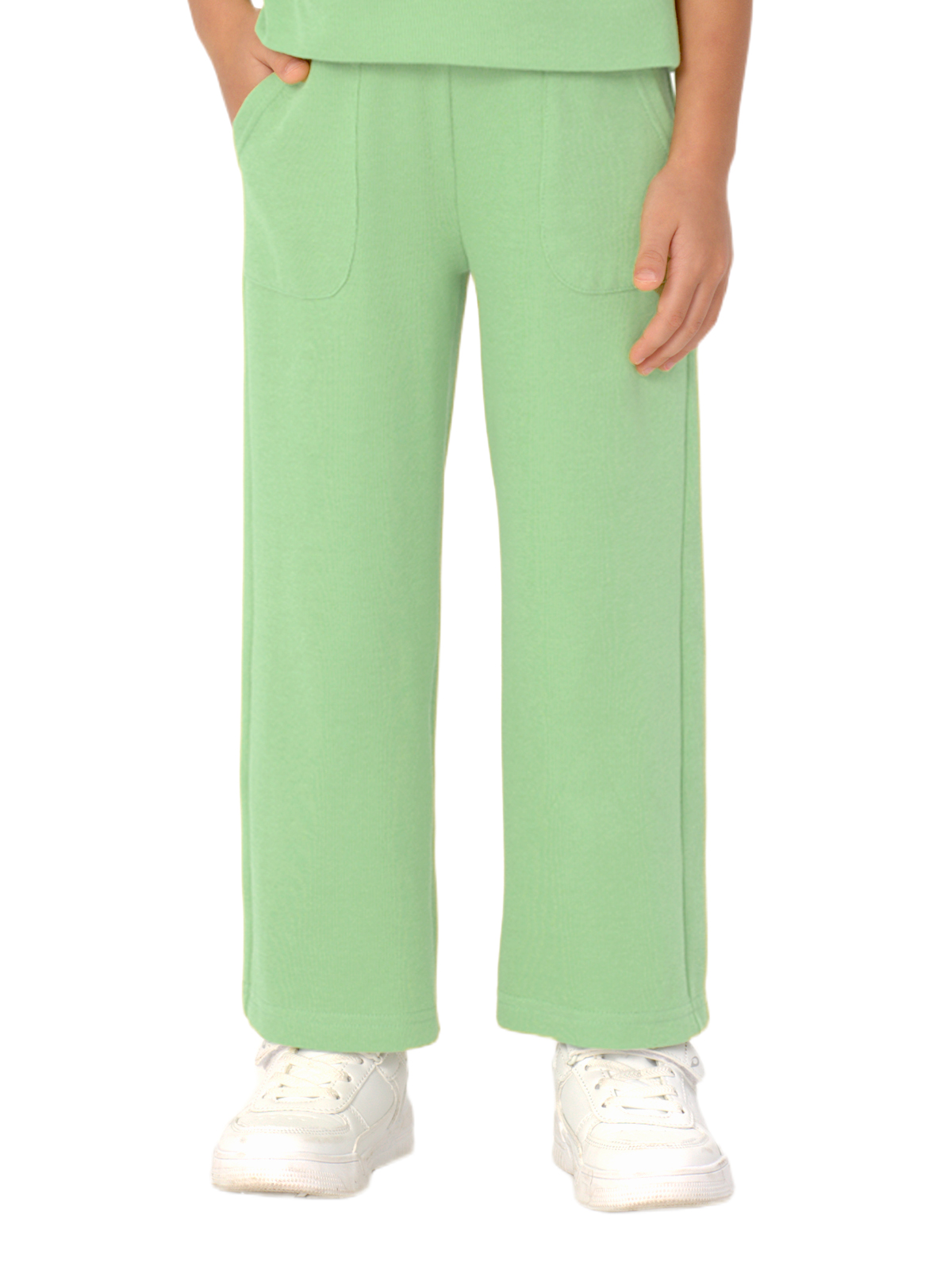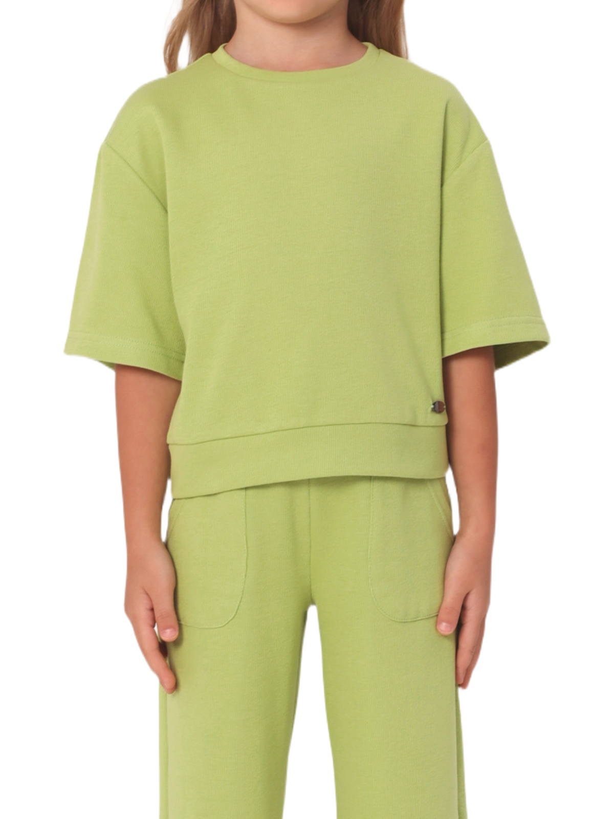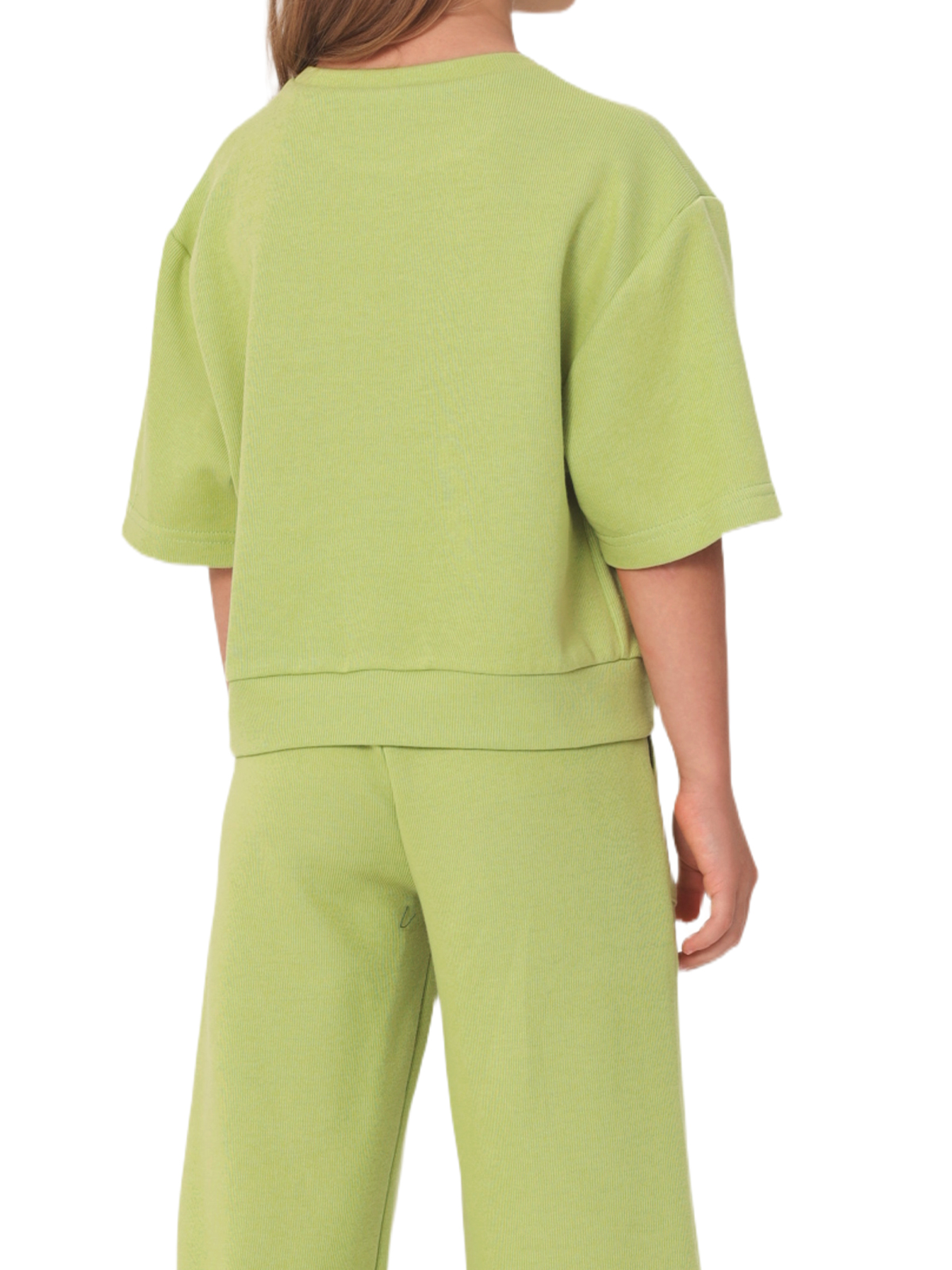Комплект из джемпера и брюк из плотного фактурного трикотажа, укороченный джемпер оверсайз со спущенным плечом, короткие рукава, по горловине притачивается бейка, к низу притачивается пояс, на полочке металлическое украшение с логотипом, свободные брюки с притачным поясом с эластичной лентой, на передних половинках накладные карманы.