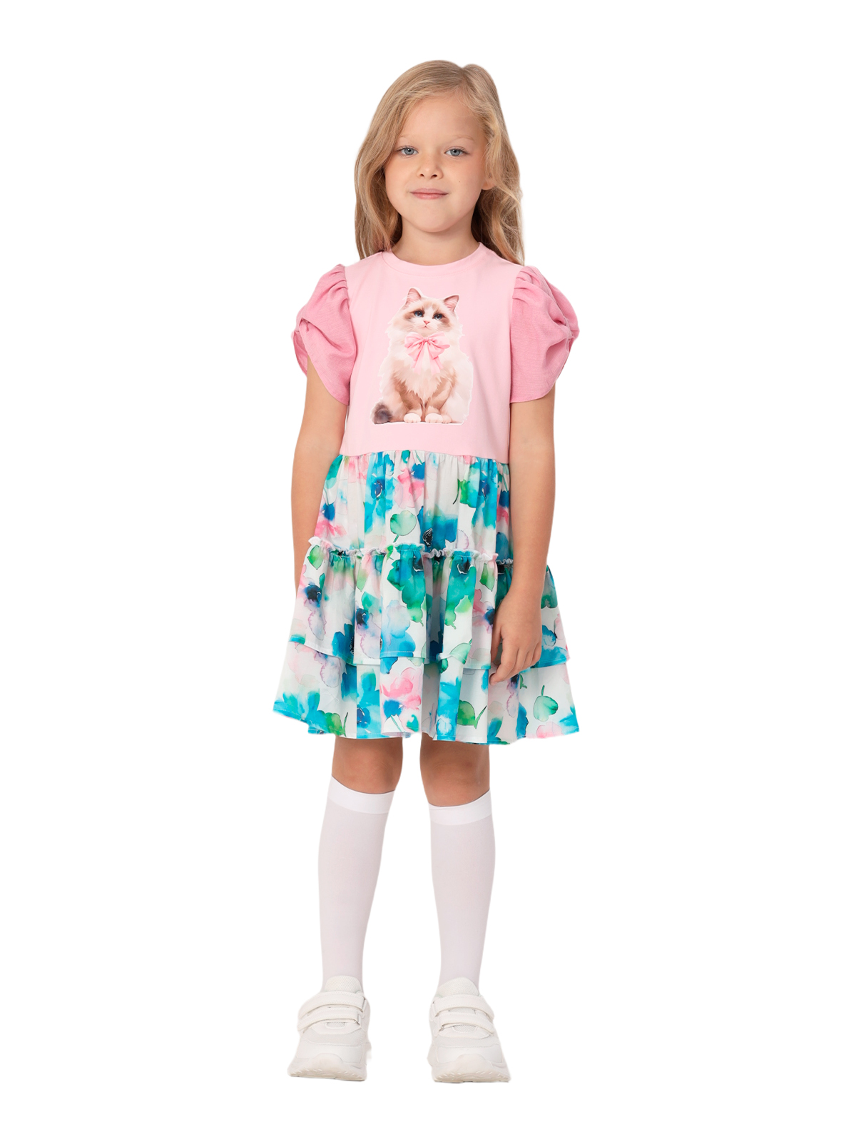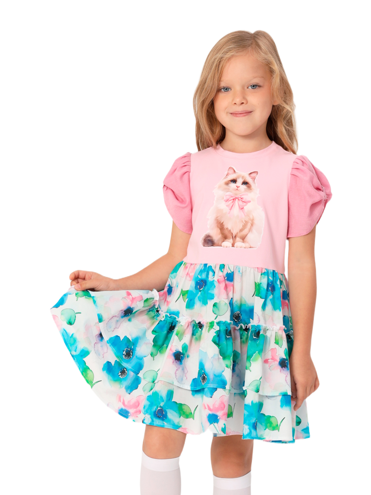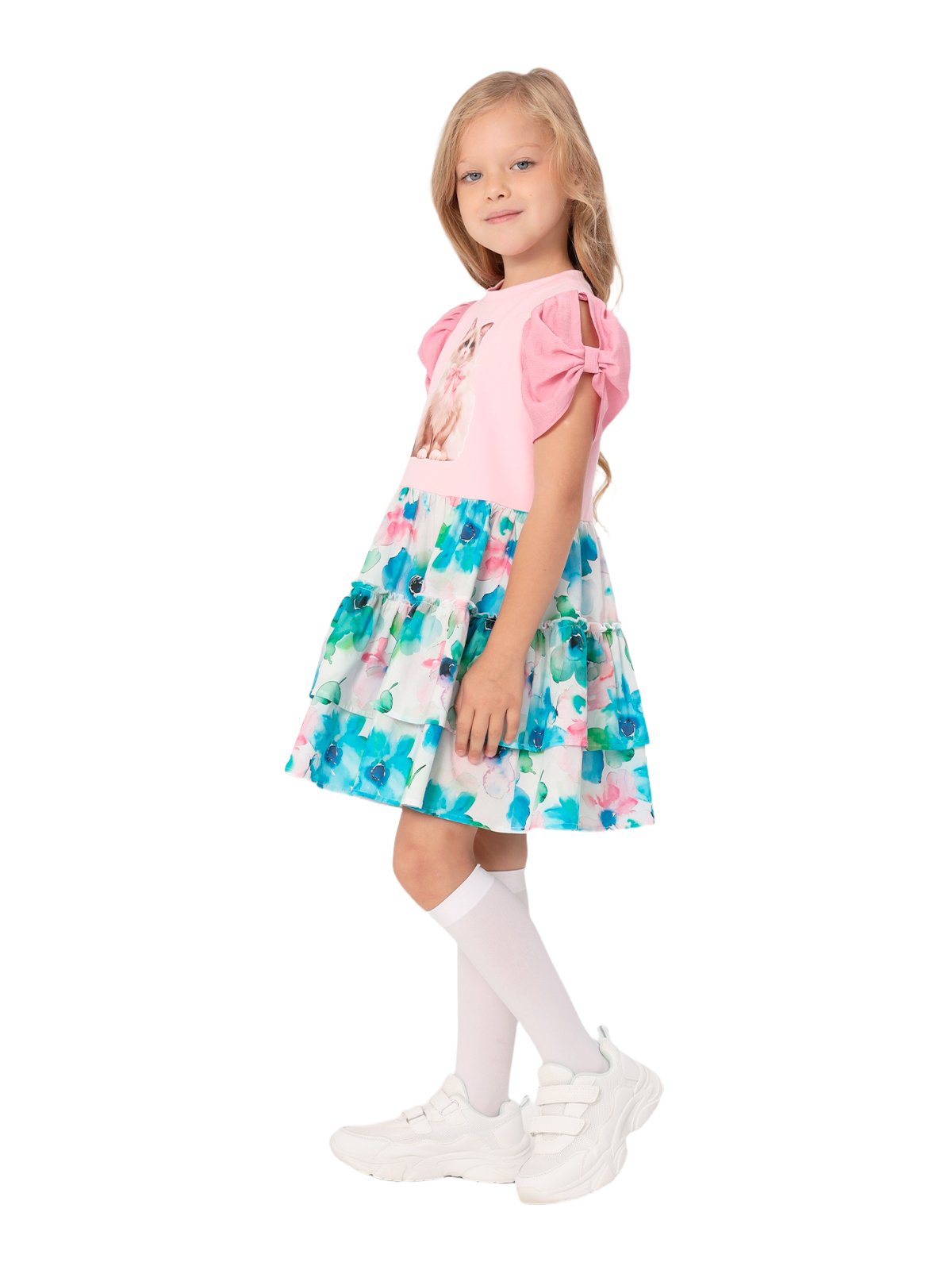 Платье отрезное по талии, лиф выполнен из тонкого трикотажа, юбка – из тонкого хлопка с дизайнерским принтом, короткие рукава из фактурной легкой ткани со сборкой, имитация банта, по горловине притачивается бейка, юбка со сборкой, на юбку настрачивается оборка, на полочке принт.