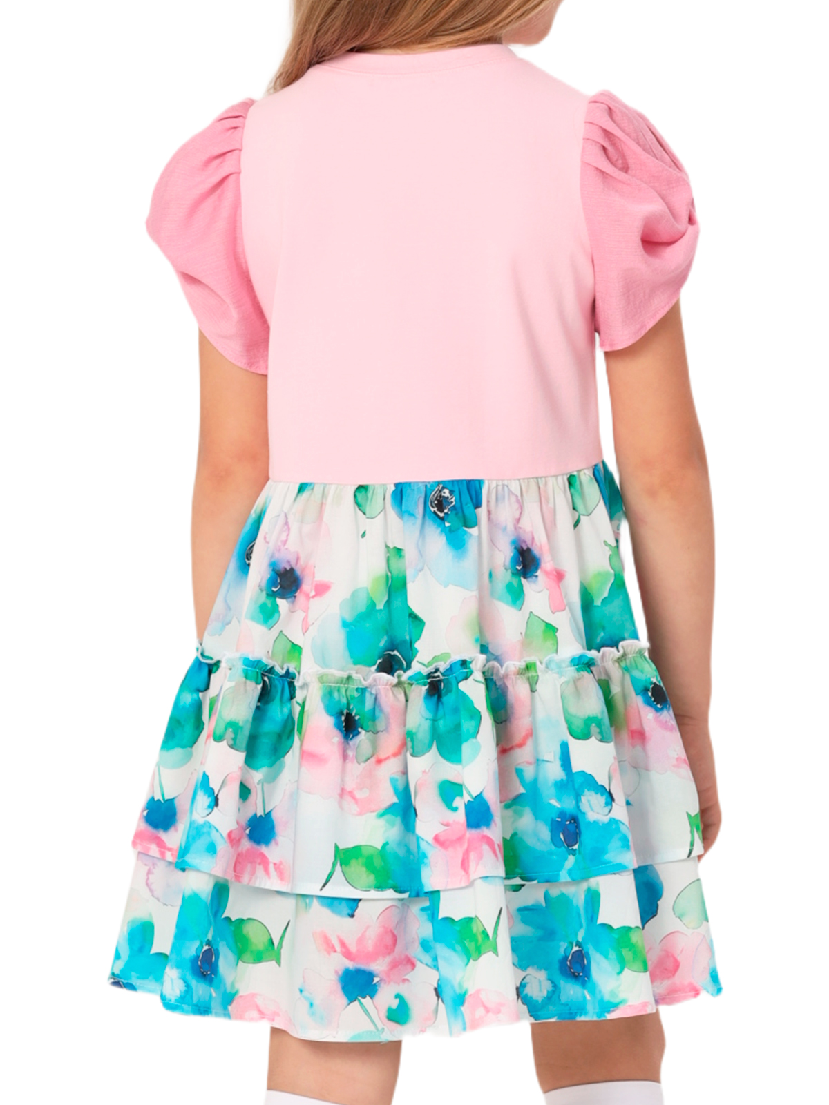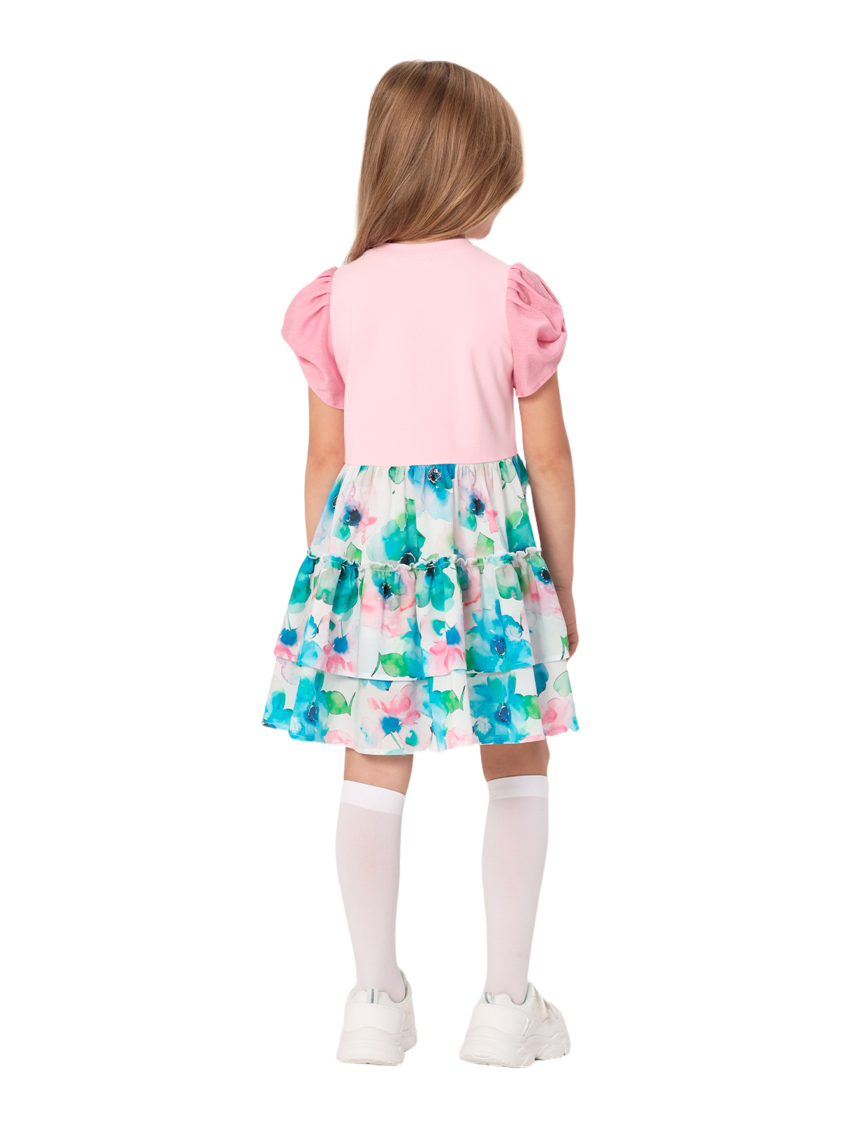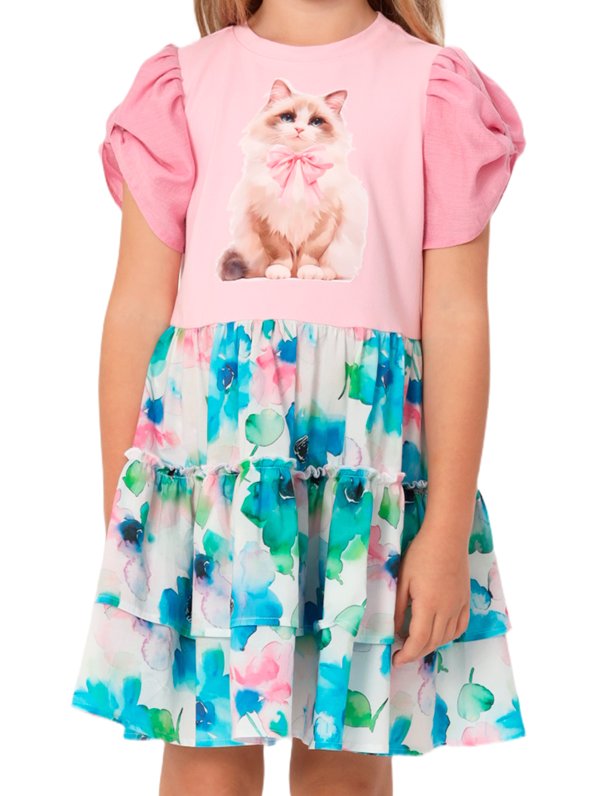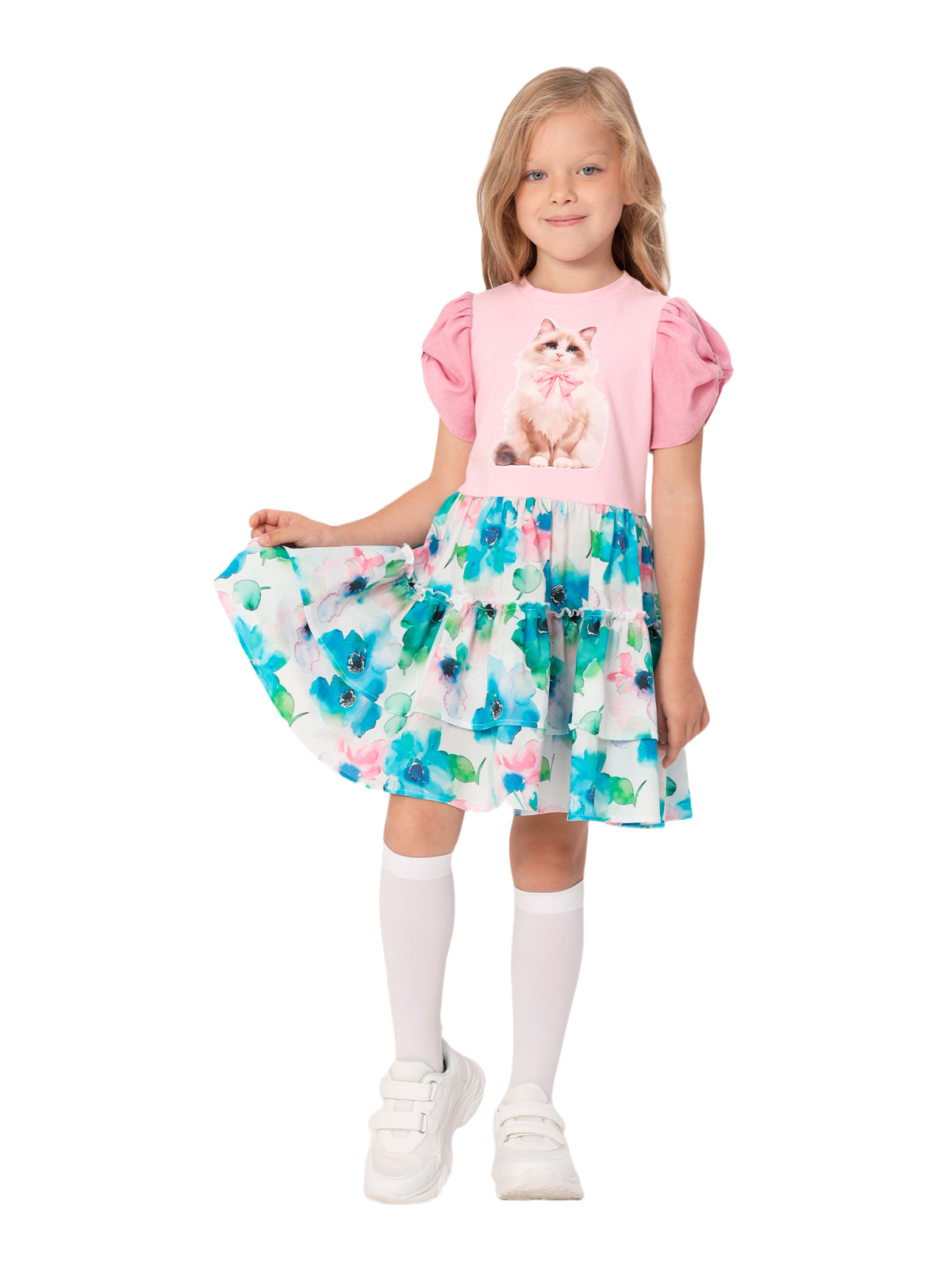Платье отрезное по талии, лиф выполнен из тонкого трикотажа, юбка – из тонкого хлопка с дизайнерским принтом, короткие рукава из фактурной легкой ткани со сборкой, имитация банта, по горловине притачивается бейка, юбка со сборкой, на юбку настрачивается оборка, на полочке принт.