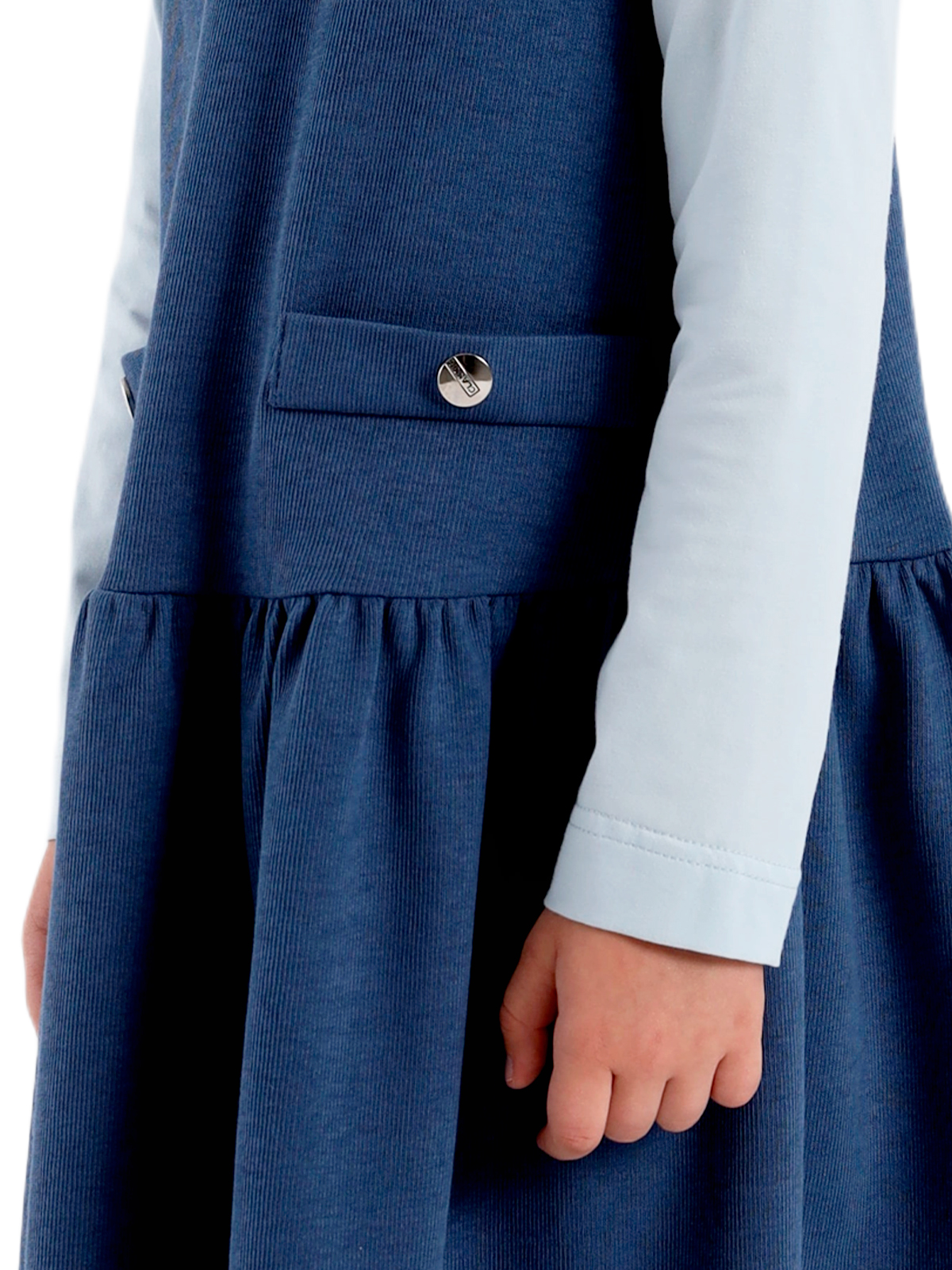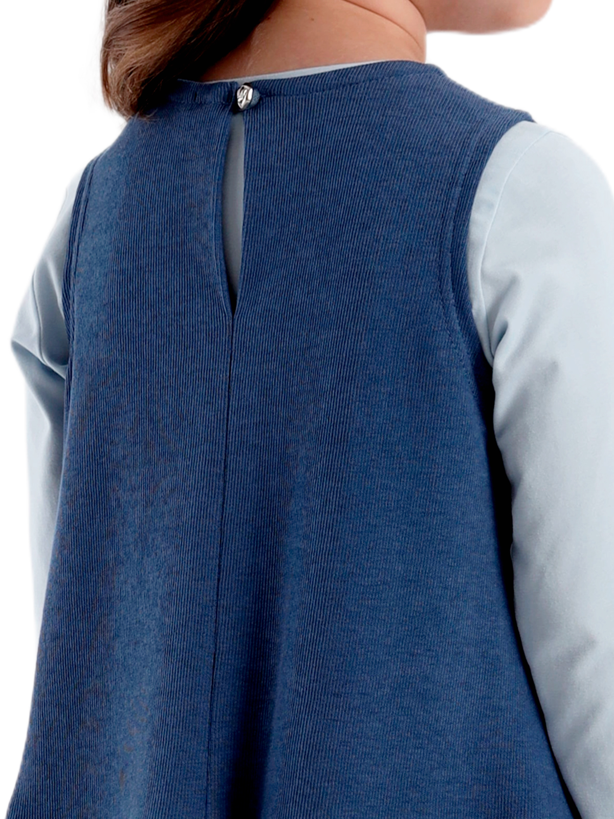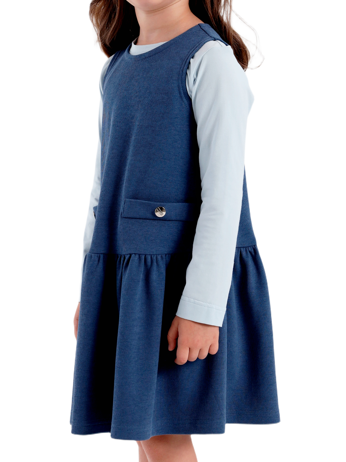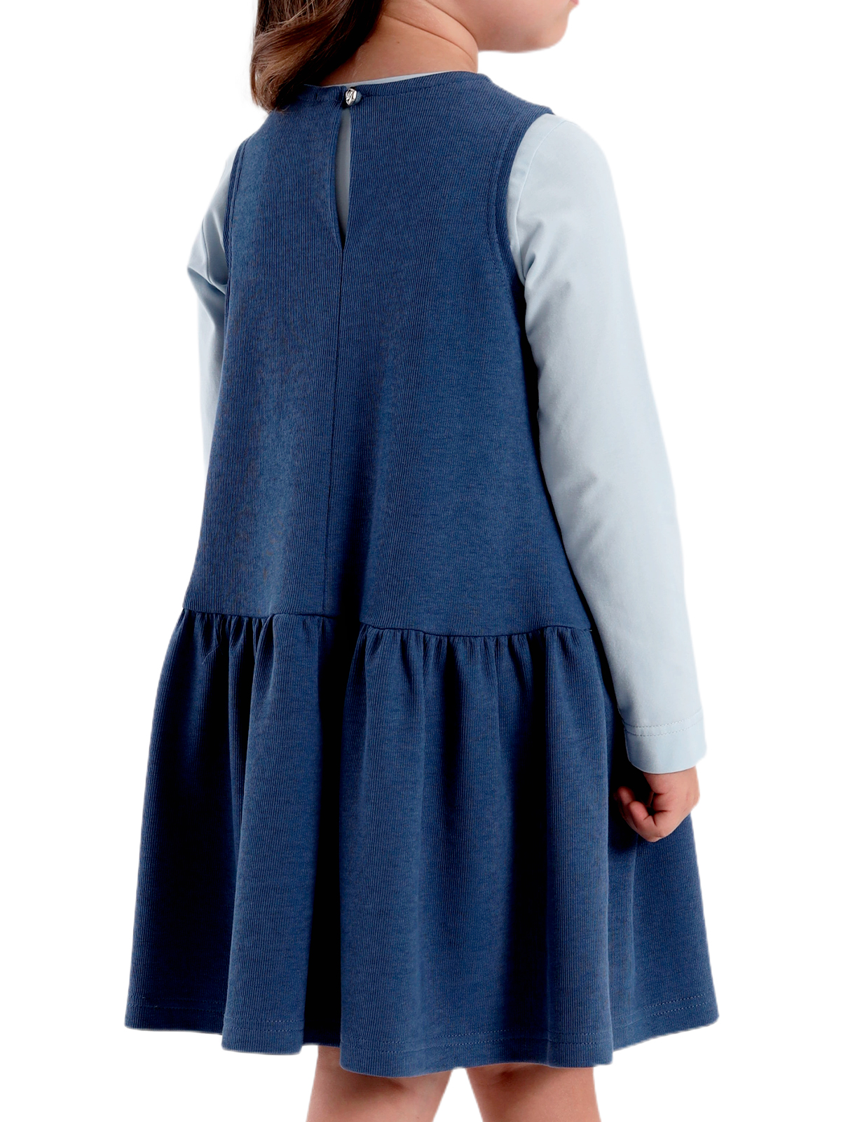 Сарафан трапециевидного силуэта из плотного фактурного трикотажа, заниженная линия талии, юбка со сборкой, круглая горловина, на полочке настрочены две листочки, на спинке средний шов с застежкой в виде разреза с пуговицей.