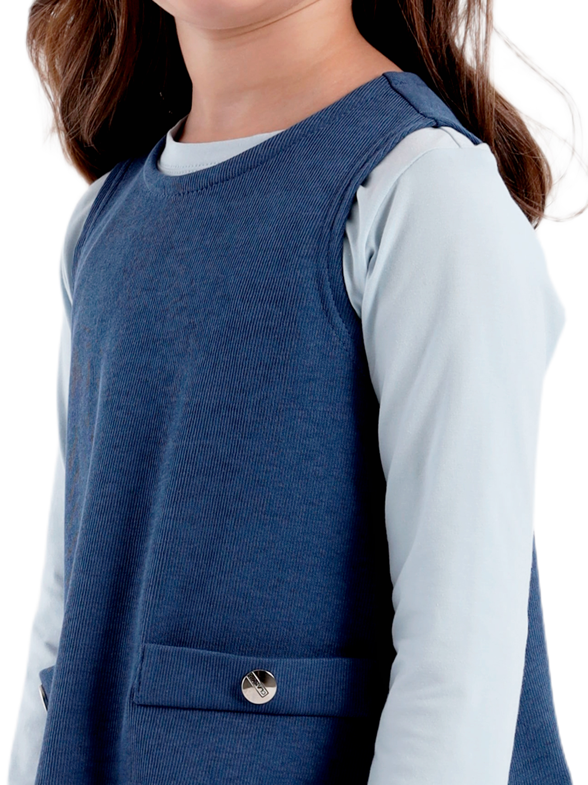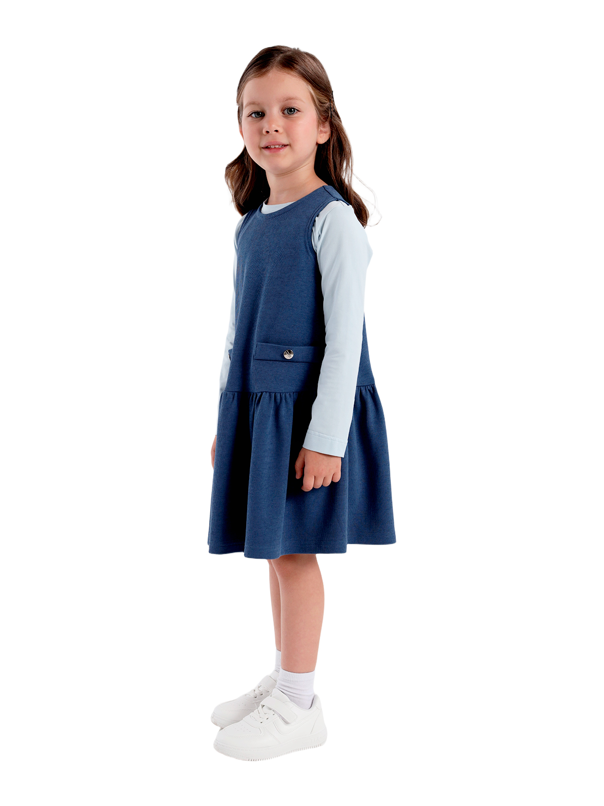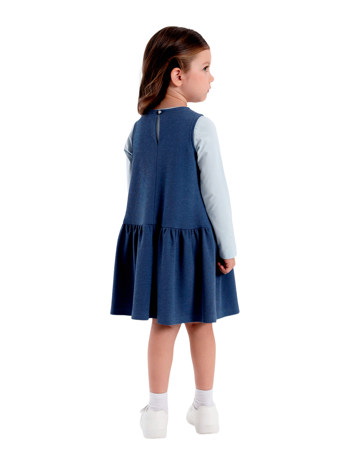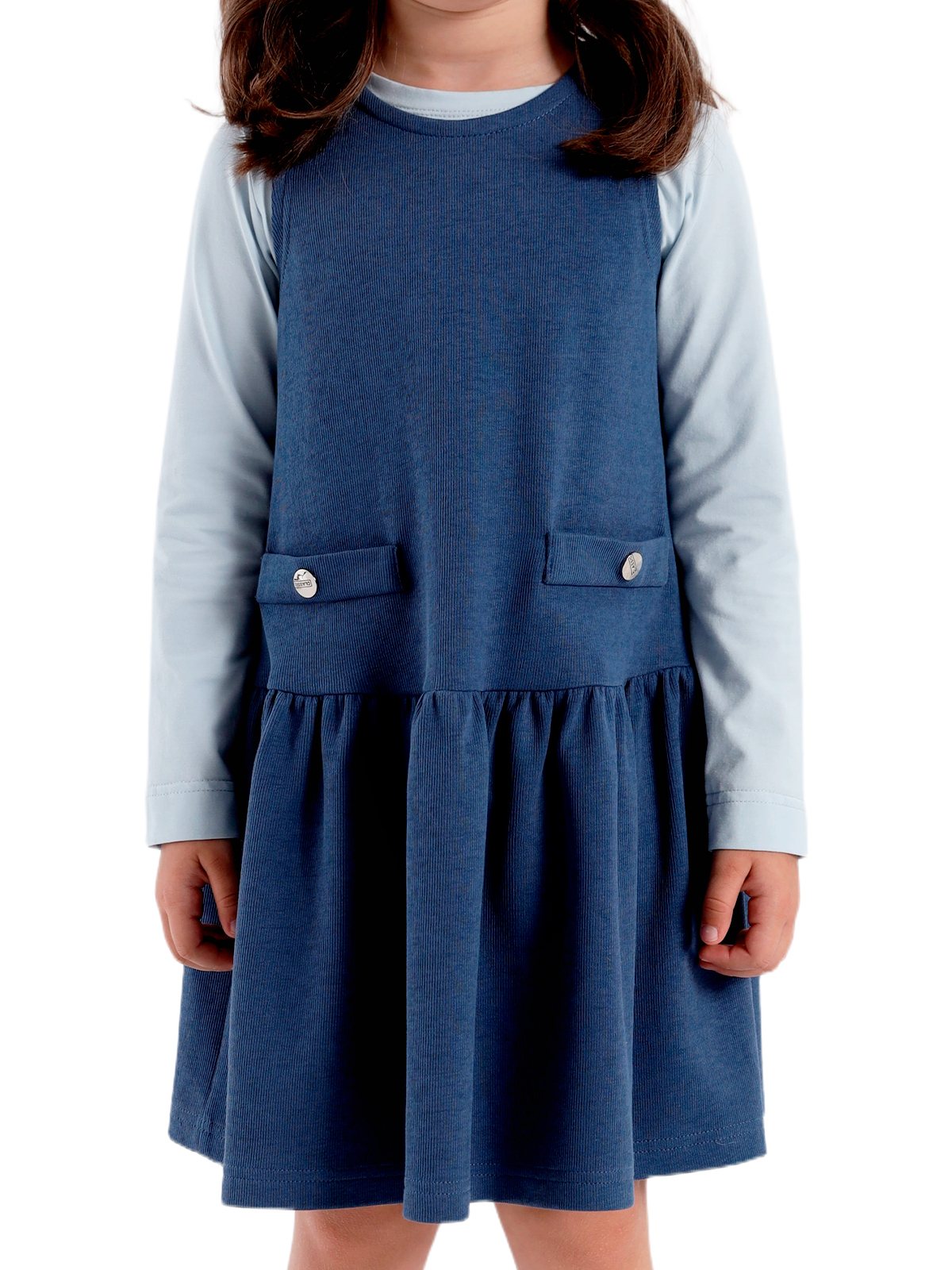 Сарафан трапециевидного силуэта из плотного фактурного трикотажа, заниженная линия талии, юбка со сборкой, круглая горловина, на полочке настрочены две листочки, на спинке средний шов с застежкой в виде разреза с пуговицей.