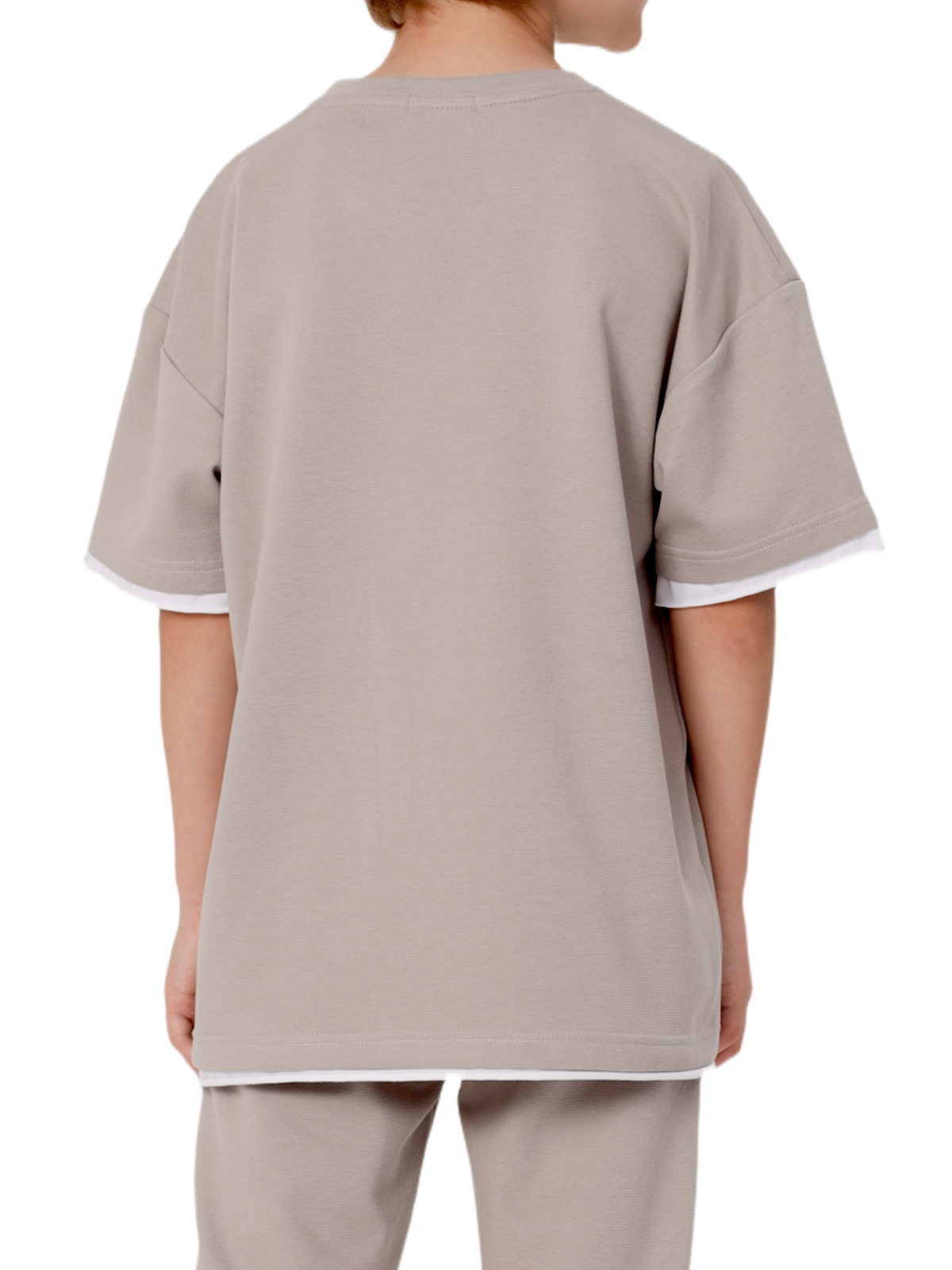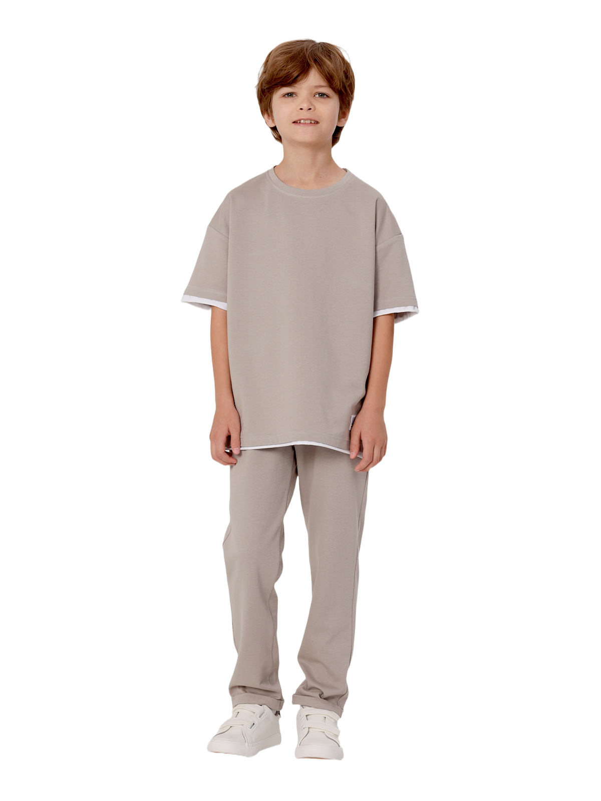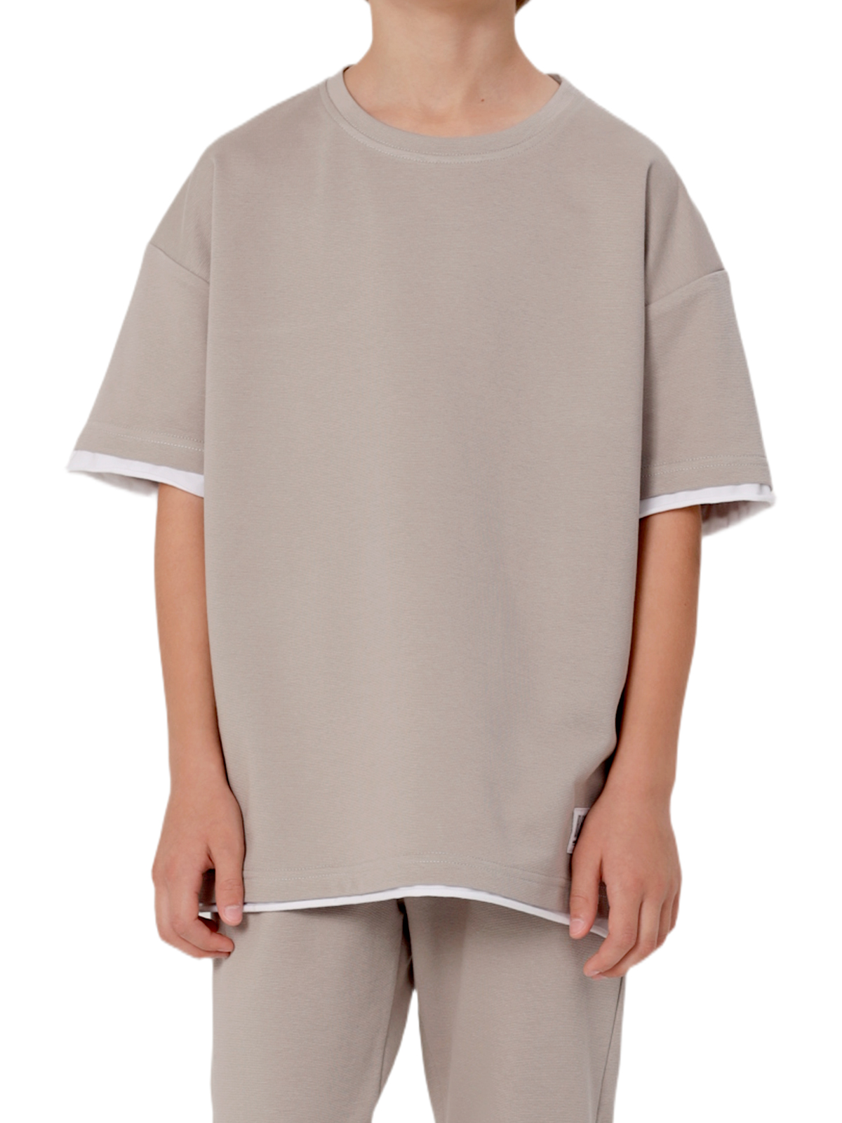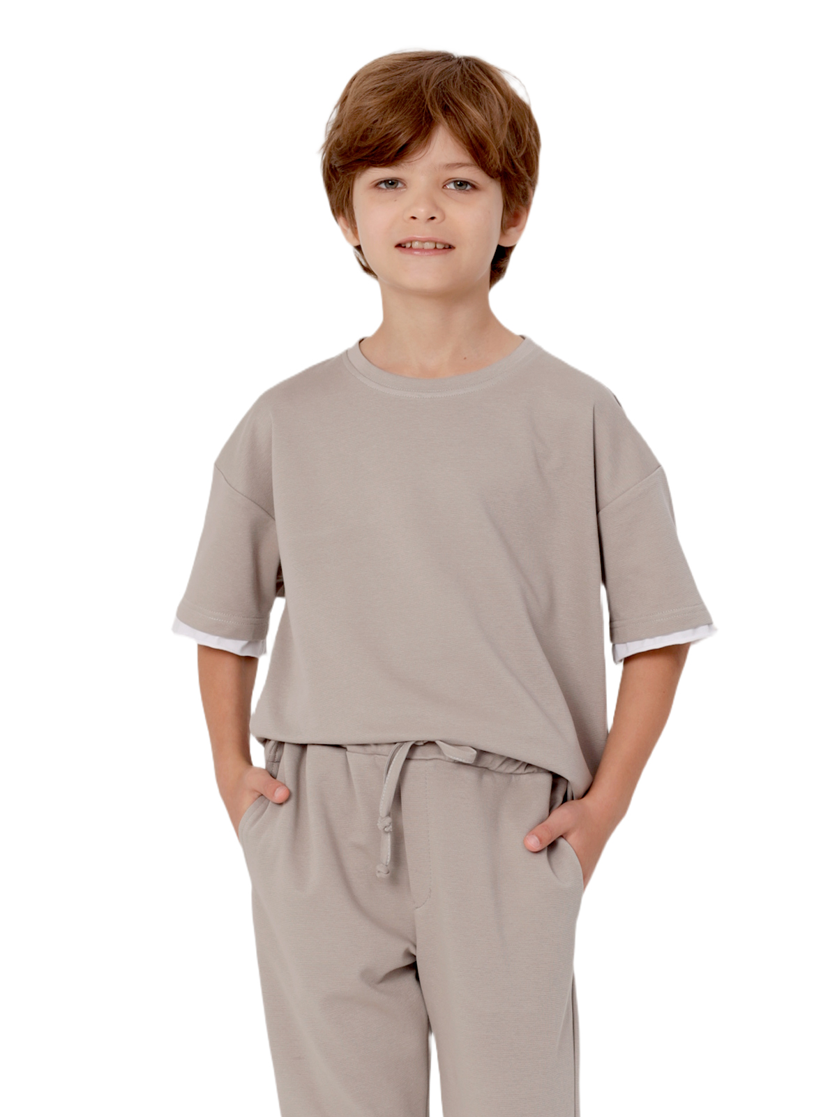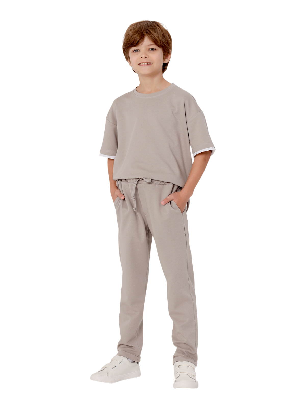Комплект состоит из джемпера и брюк из смесового трикотажа, свободный джемпер-футболка, спущенное плечо, короткий рукав, к низу рукавов и основе притачивается контрастная деталь с необработанным краем, по горловине притачивается бейка, на полочке нашивка; брюки с притачным поясом с внутренней эластичной лентой, со шнурком, карманы в боковых швах.