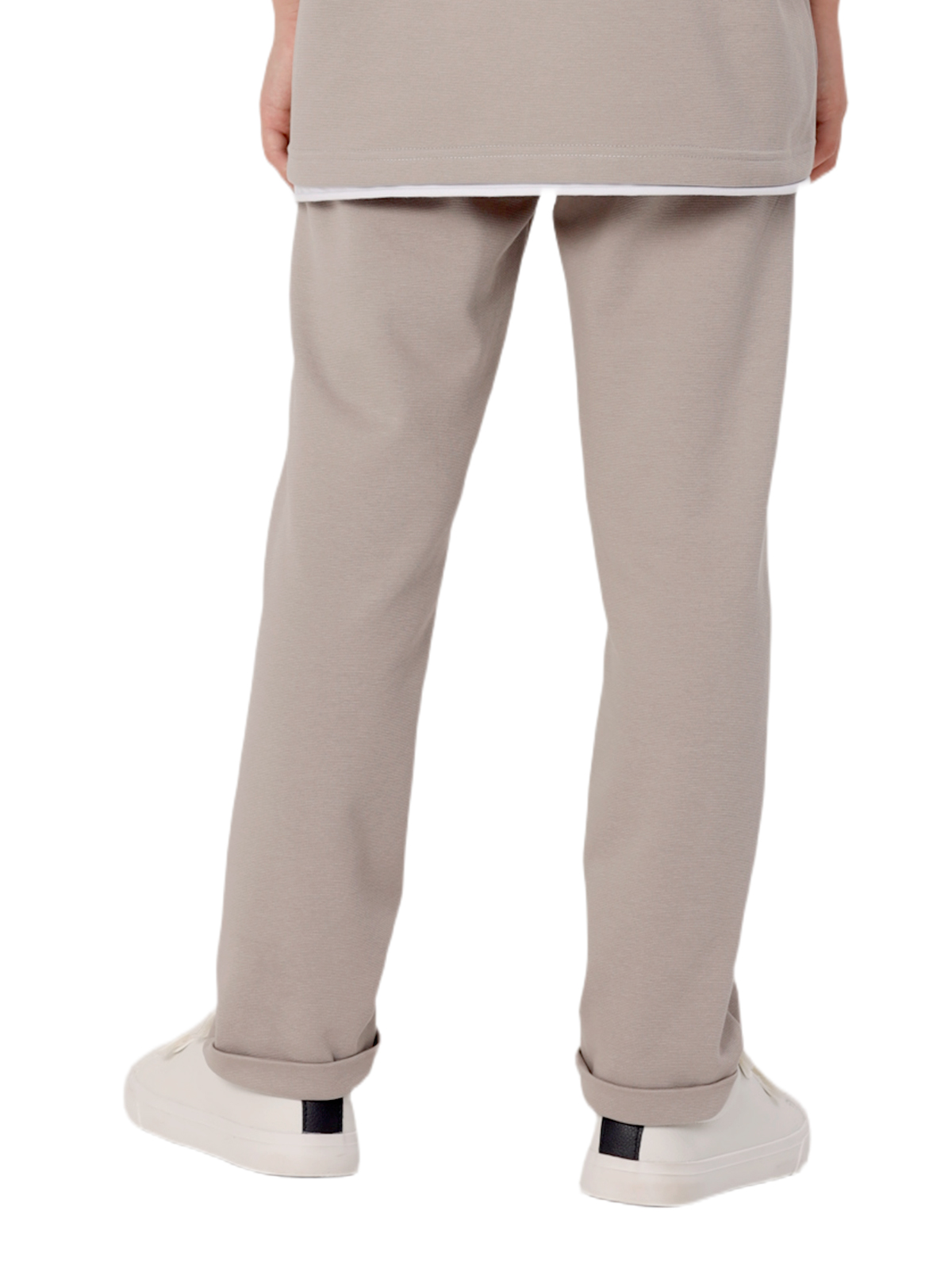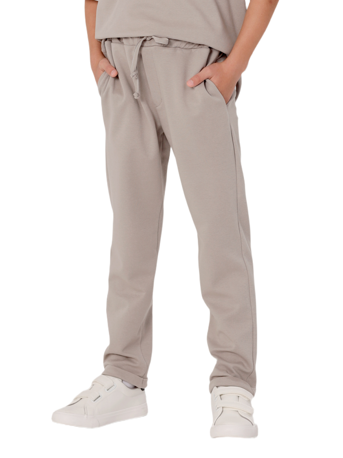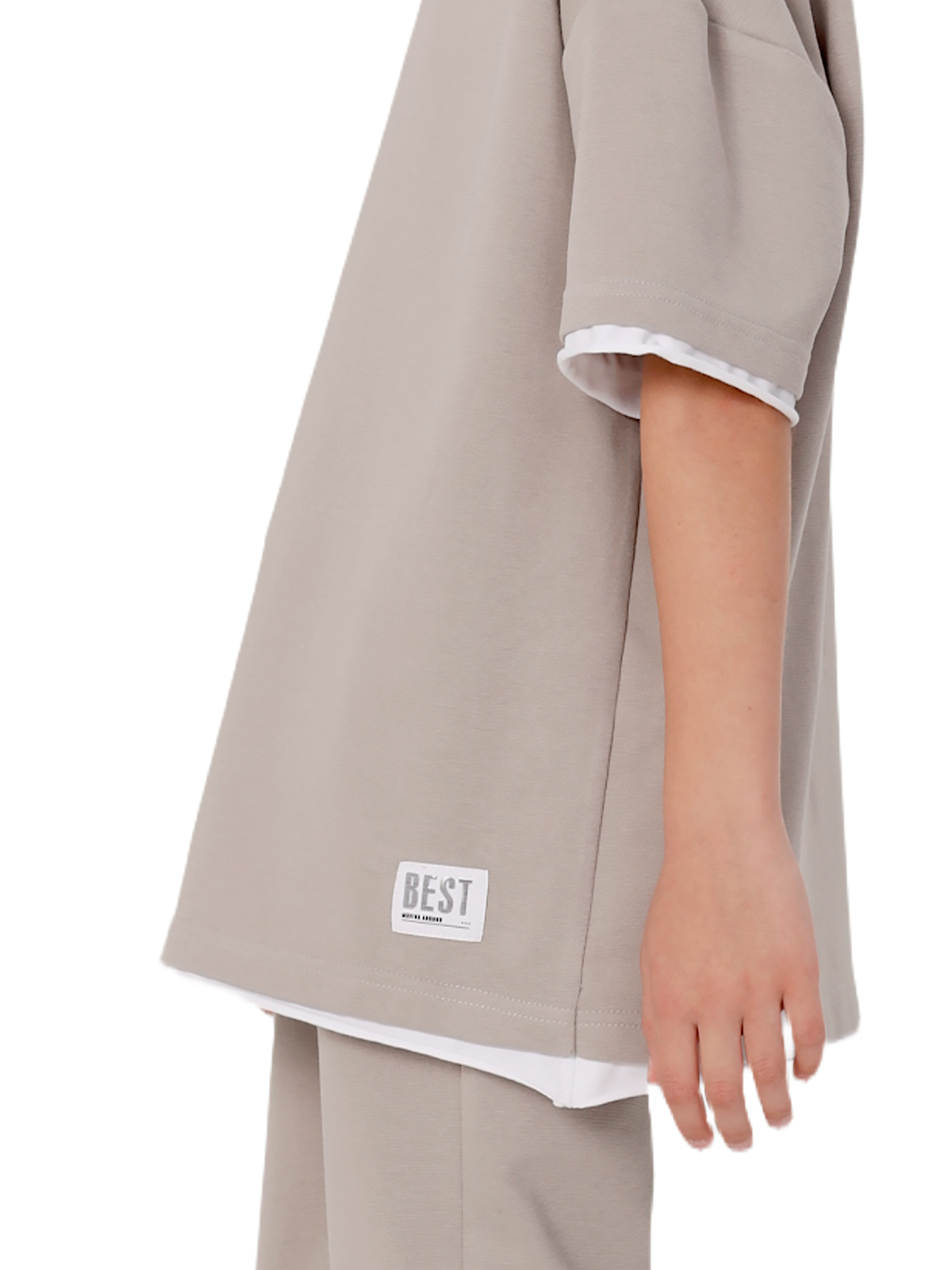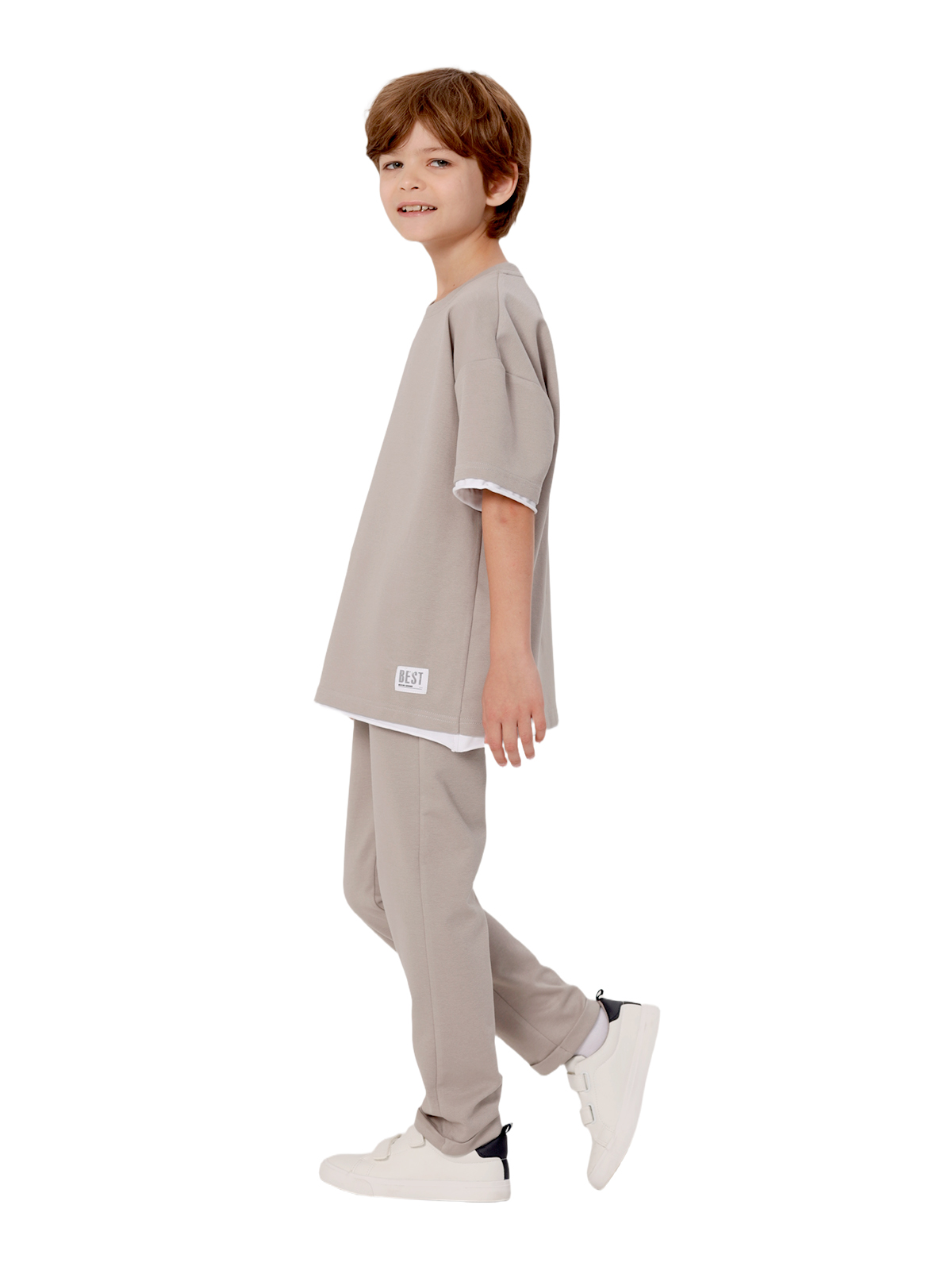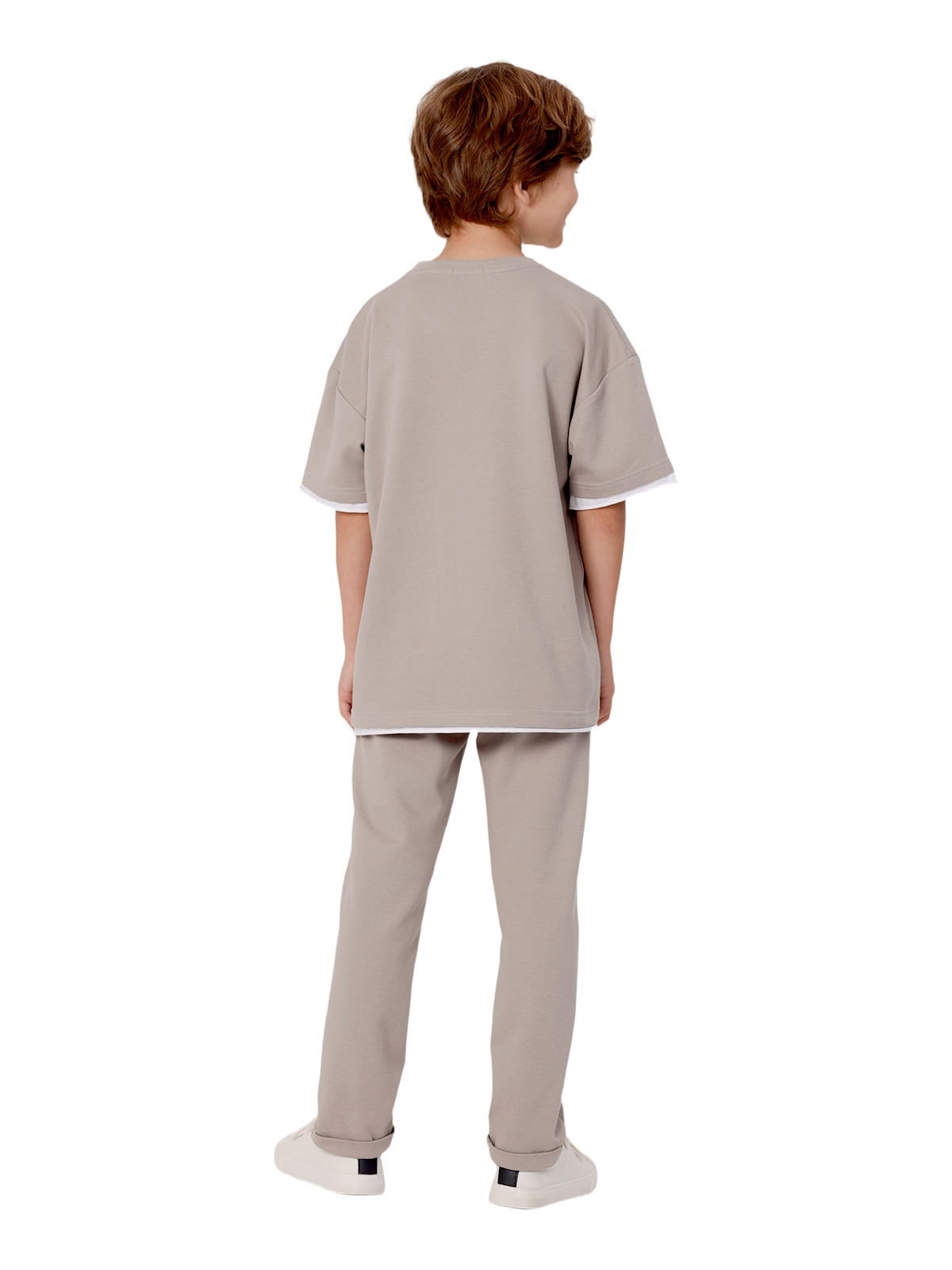 Комплект состоит из джемпера и брюк из смесового трикотажа, свободный джемпер-футболка, спущенное плечо, короткий рукав, к низу рукавов и основе притачивается контрастная деталь с необработанным краем, по горловине притачивается бейка, на полочке нашивка; брюки с притачным поясом с внутренней эластичной лентой, со шнурком, карманы в боковых швах.