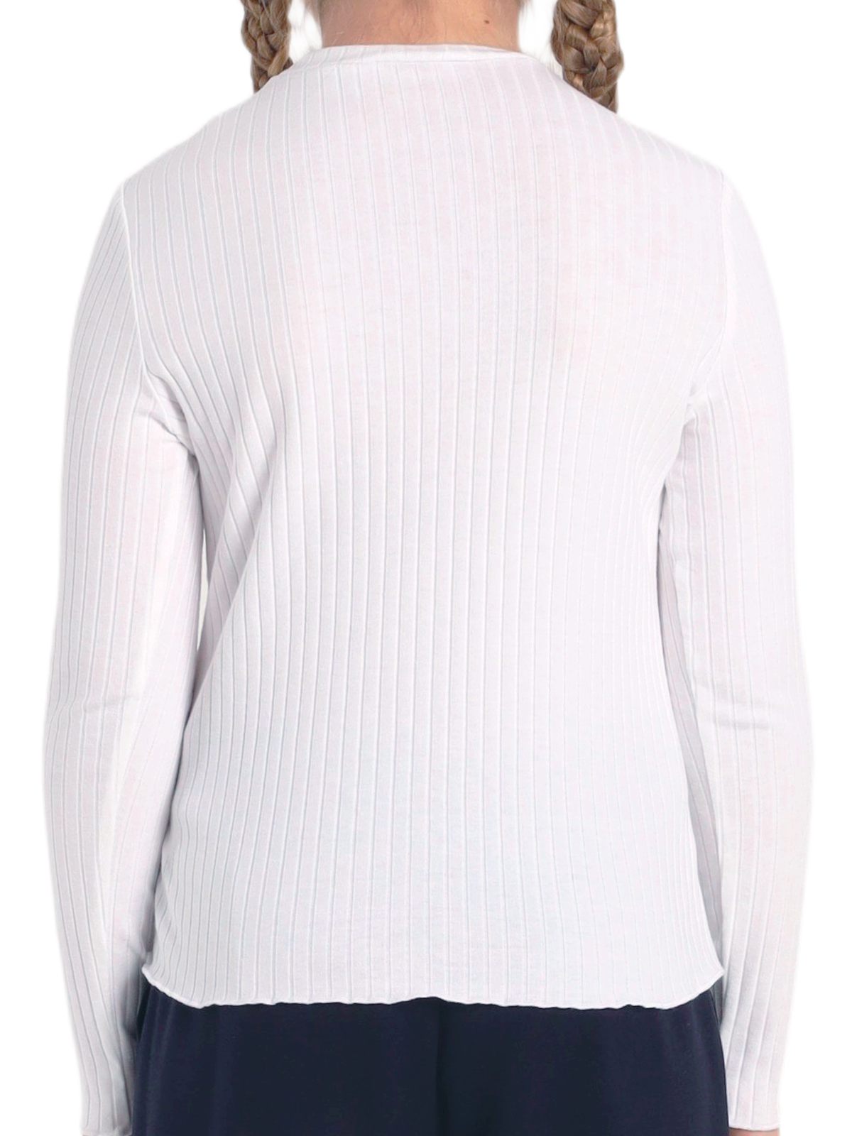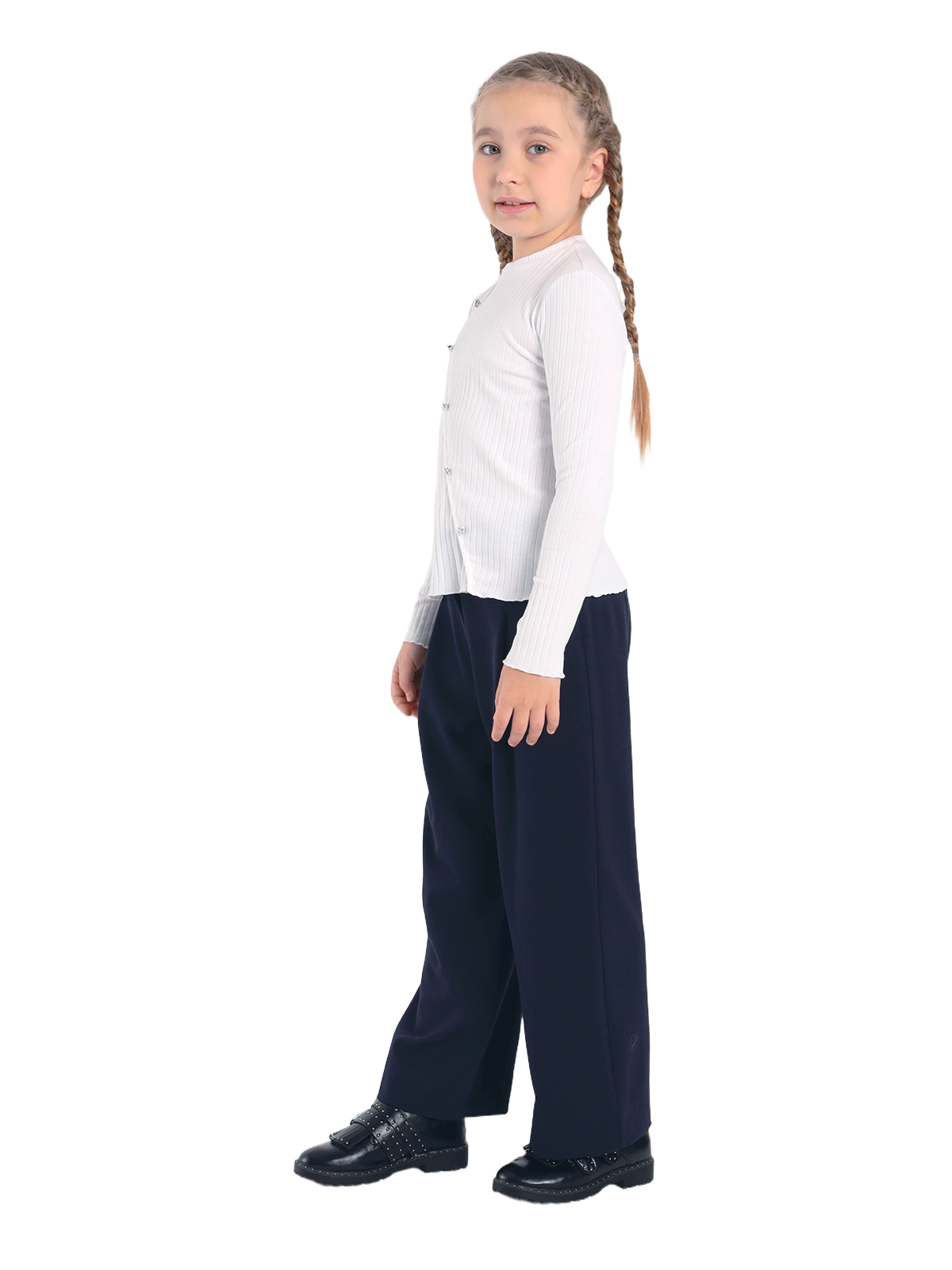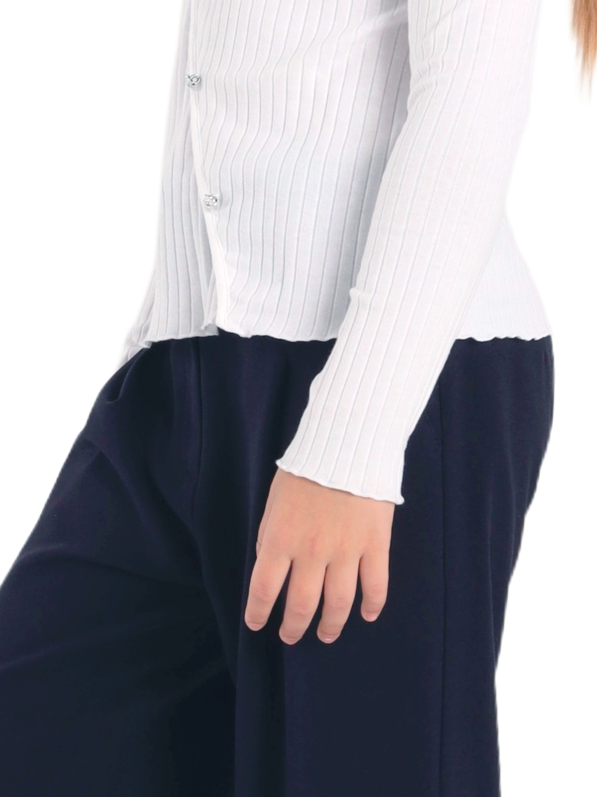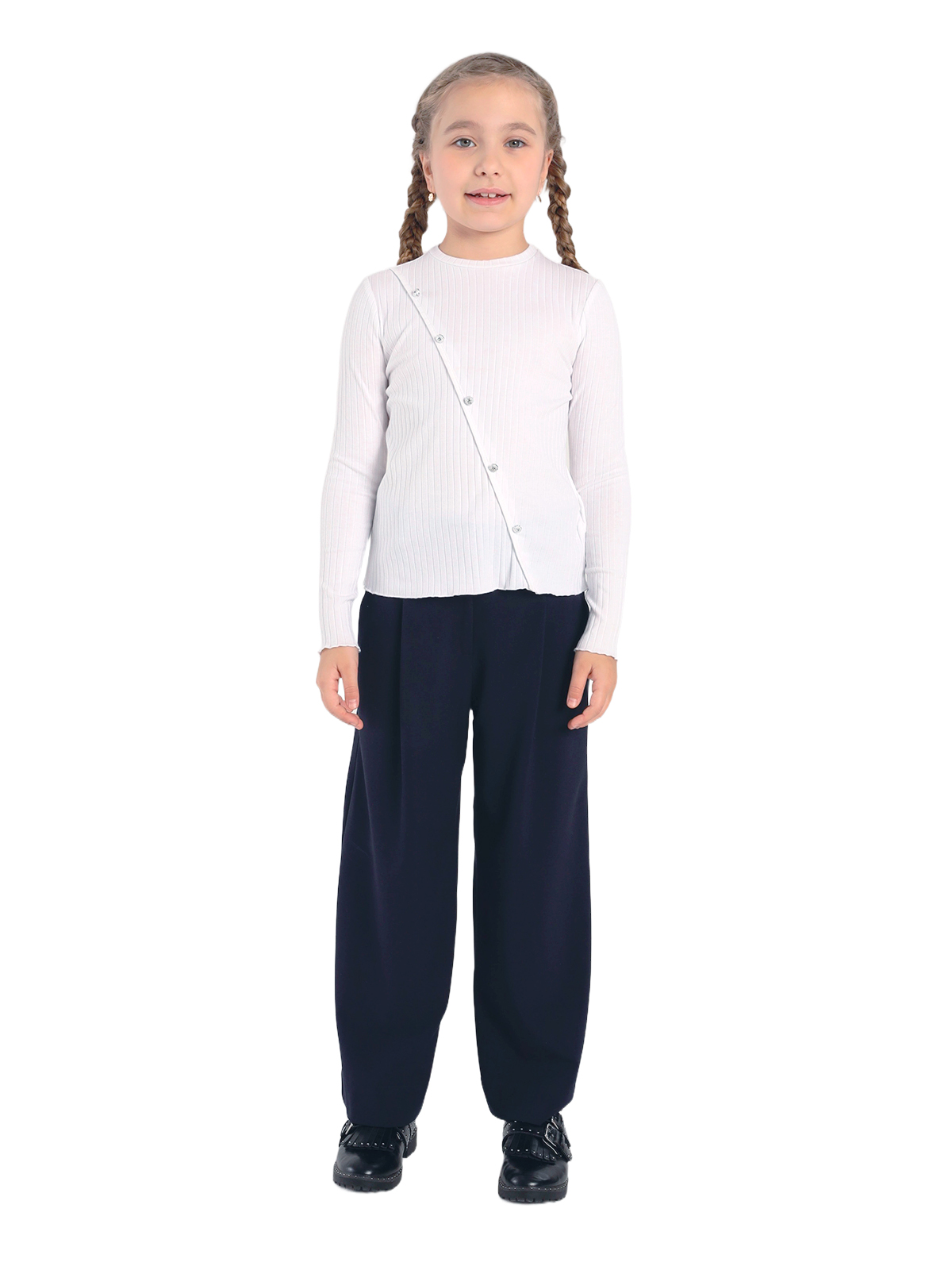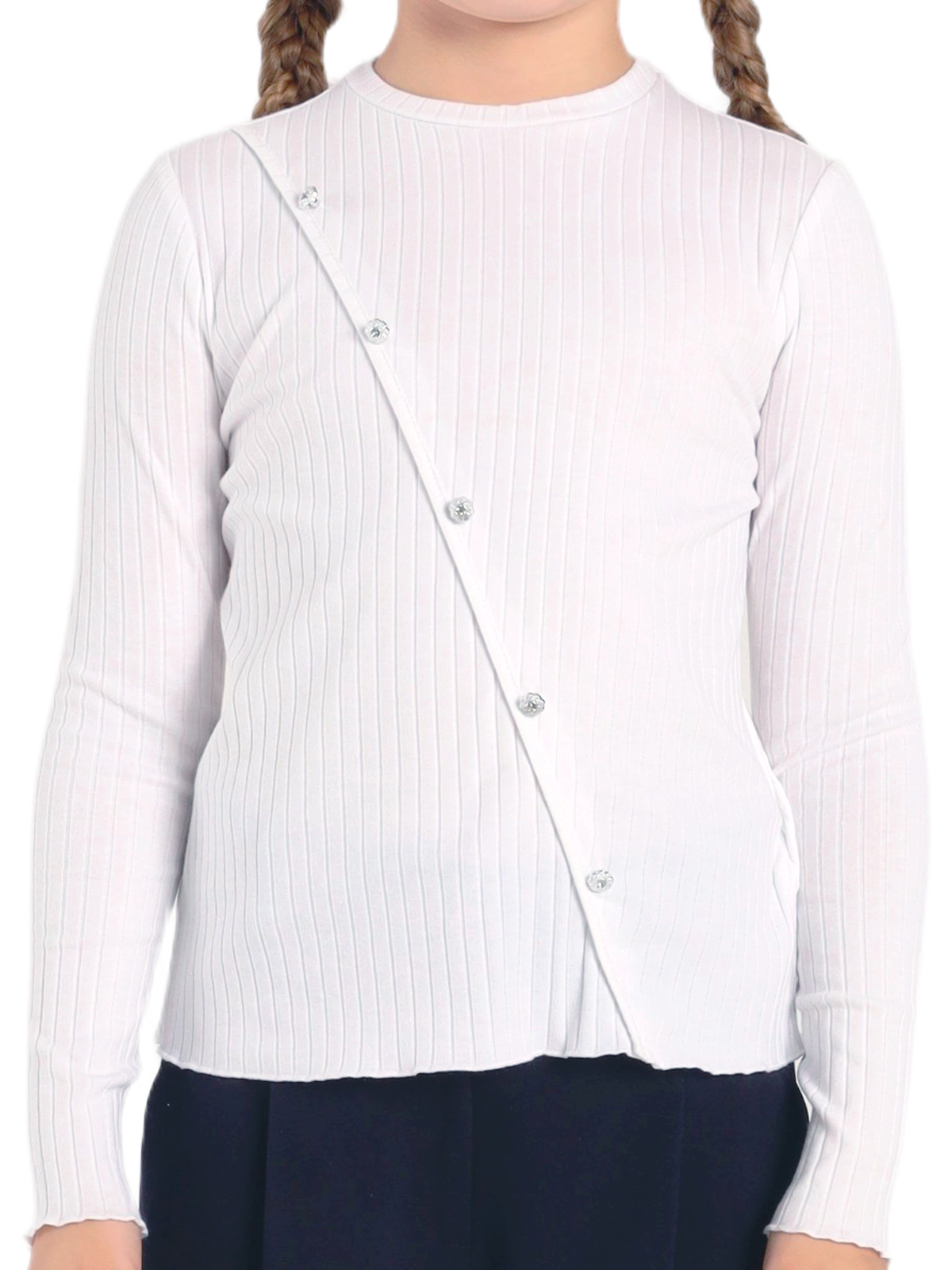 Джемпер из фактурного трикотажа, длинные рукава, по горловине притачивается бейка, на полочке имитация ассиметричной застежки с пуговицами.
